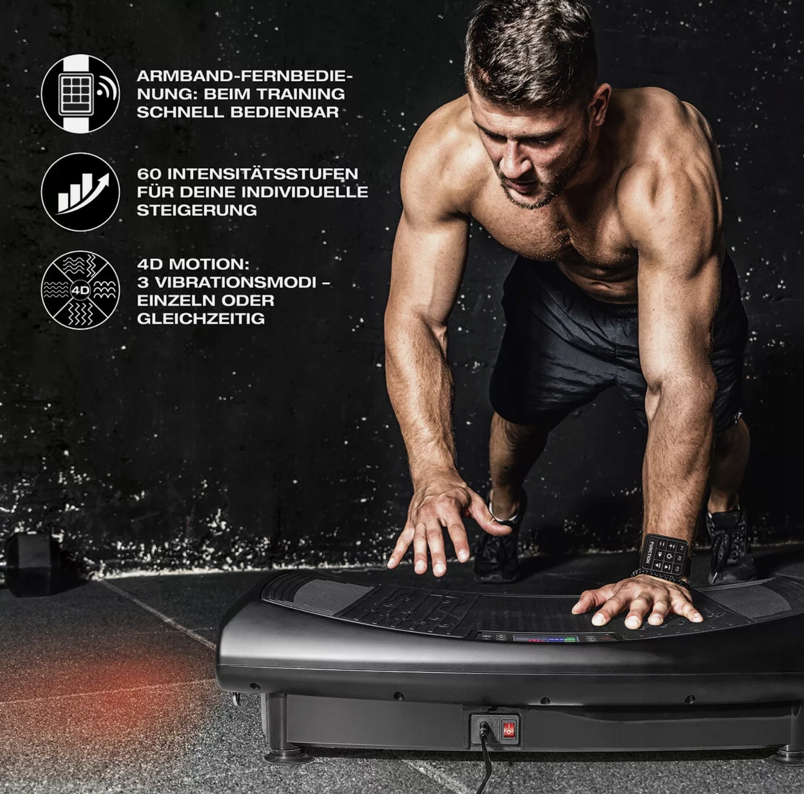 Для более четкого тела, более быстрой мышечной структуры и повышенного сжигания жира: благодаря тренировке вибрации вы можете достичь необычных результатов за короткое время, потому что вибрации на тарелке - в отличие от многих популярных тренингов - достичь и укрепить глубокие мышцы. Наша эффективная 4D -вибрационная платформа с изогнутой формой с тремя двигателями предлагает 3 режима вибрации (вертикальные, горизонтальные и колебательные), а также 4D -эффект со всеми режимами вибрации одновременно. 60 Уровни интенсивности допускают индивидуальное развитие. Практический пульт дистанционного управления в виде браслета может быть быстро эксплуатироваться в любое время, поэтому вы можете закончить тренировку без перерывов. Если вы хотите дополнительно выработать мышцы плеча, просто пройдите для прикрепленных десен и пройти тренировку всего тела. Благодаря интегрированному громкоговорителям с беспроводной связи вы можете включить свой собственный звук во время обучения, что предоставит вам дополнительную дозу мотивации. Вибрирующий, 1 -кратный коврик, 2 -кратный расширитель, 1x пульт дистанционного управления в виде полосы запястья, 1 X Controller