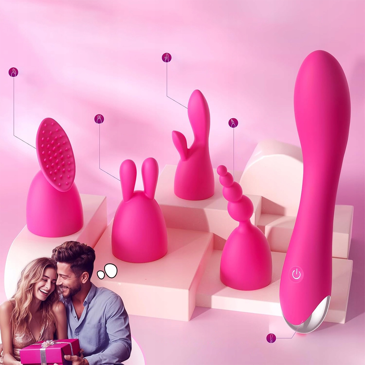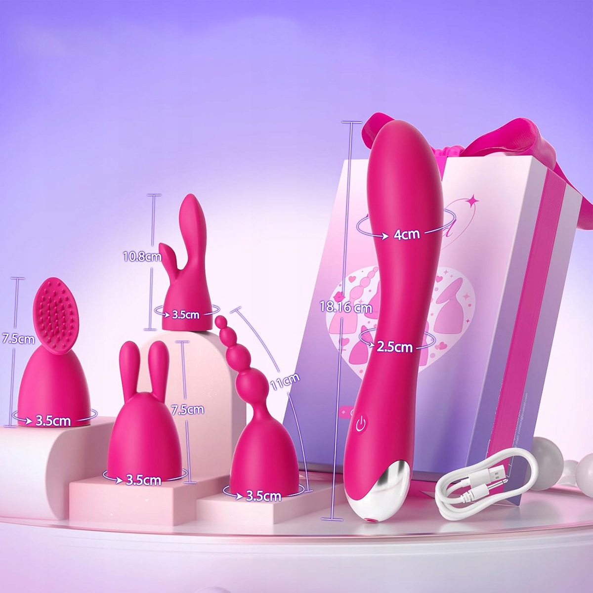 ➡️4 сменные насадки для различной стимуляции: В комплект вибраторов для женщин входят 4 специальные силиконовые насадки для разных зон: шапочка с кроличьими ушками. Вибратор для точки G. Анальные бусы. Массажная щетка с 39 мягкими щетинками на точках стимуляции.