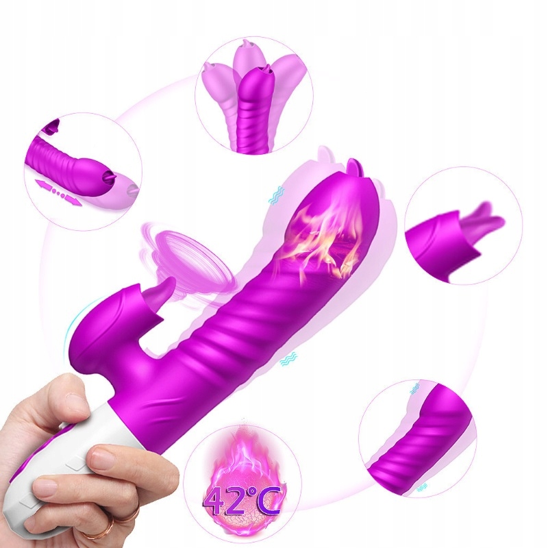 7 режимов вибрации, пульсации и подъема основного вала и стимулятора в сочетании с движением язычка. 3 скорости движения вверх/вниз в сочетании с плавным вращением.