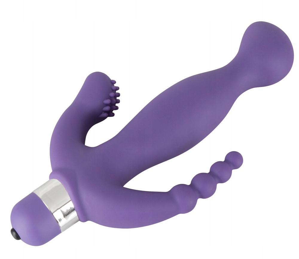 Это редкий массажер фиолетового цвета с тремя типами разных вибраторов. Каждый из них стимулирует разные интимные части тела.