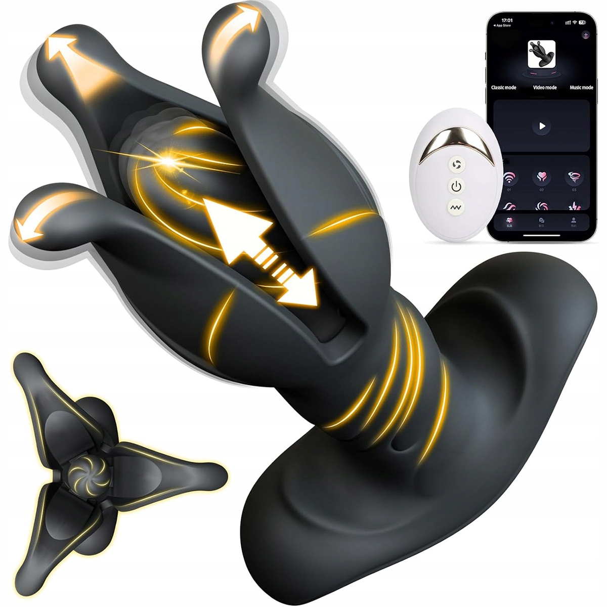 Вибратор-бабочка с функциями вибрации, колебаний, толкания и анального расширения. Усовершенствованная конструкция мужской анальной пробки «4 в 1» обеспечивает повторяющуюся, точную стимуляцию и постоянное удовольствие. Вибрирующая вилка для стимуляции простаты для мужчин легко вставляется и находит точку P, позволяя проводить повторную стимуляцию. Выступы у основания массируют и расслабляют промежность. Лепестки открываются и закрываются, растягивая анус и массируя стенки кишечника.