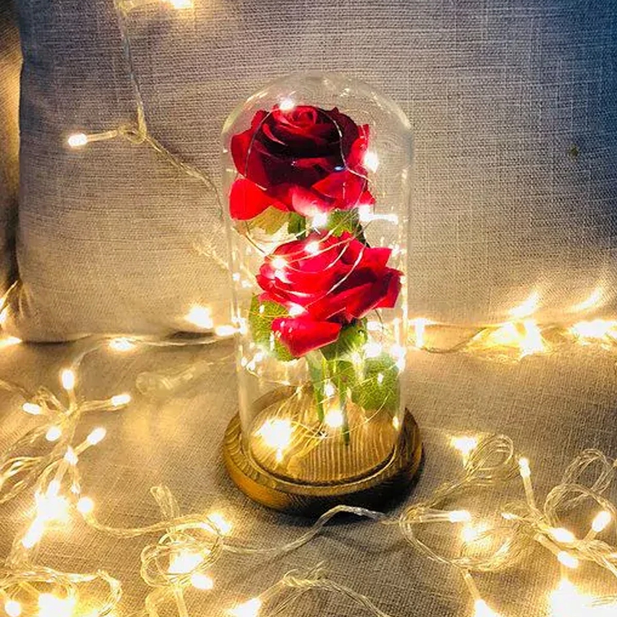 Реалистичная красная роза, обвитая нежными, светящимися светодиодными цепочками, создает волшебную атмосферу. оживит любой интерьер.