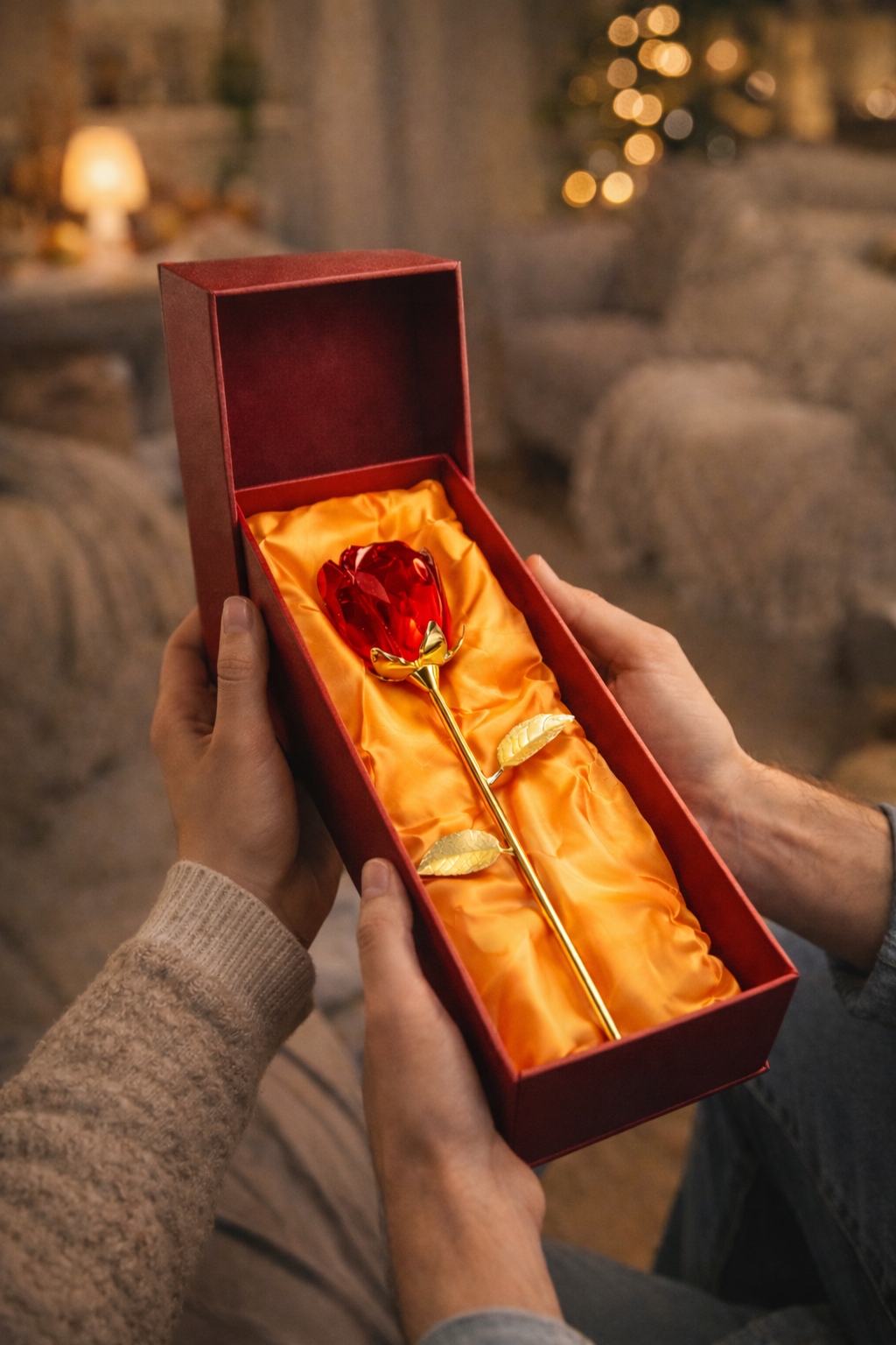 Уникальная хрустальная роза насыщенного, глубокого цвета — это элегантный и вневременной подарок, который производит впечатление с первого взгляда. Сочетание хрустальной огранки с золотым стеблем и листьями придает всей вещи роскошный характер.