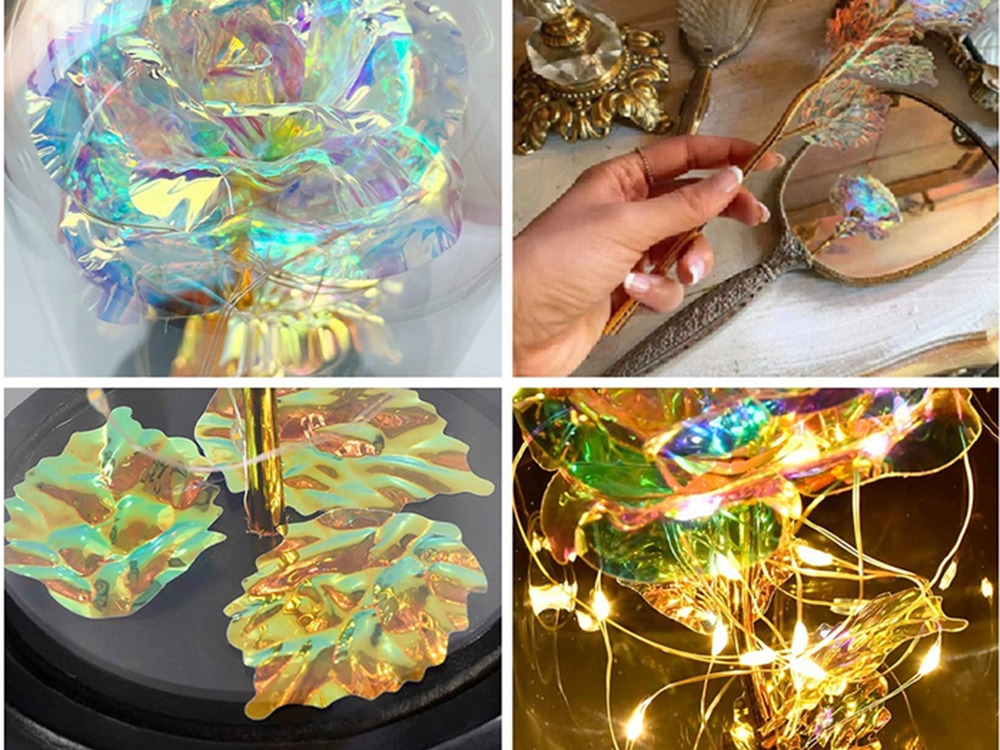 p>Нежные светоотражающие лепестки, меняют цвет в зависимости от среды, в которой находится роза. Если фон розово-красный, цвет лепестков становится розовее. Однако если фон, например, синий, украшение становится более синим и т. д.