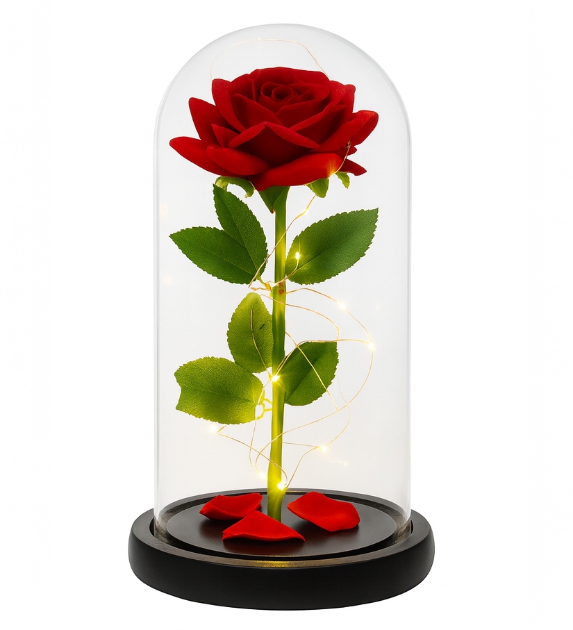 Подсвеченная роза, заключенная в элегантный бокал, привлекает внимание в любое время суток. Размещенный на письменном столе, прикроватной тумбочке или полке в гостиной, он создает теплую, романтическую атмосферу.