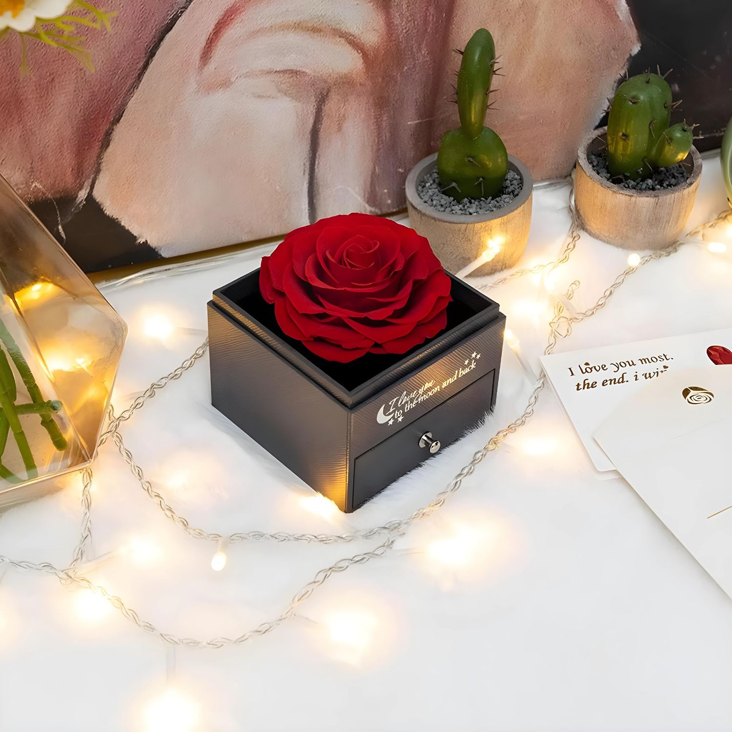 - Элегантная коробка, представляющая розу в зрелище + сумочка + специальная карта для написания пожеланий