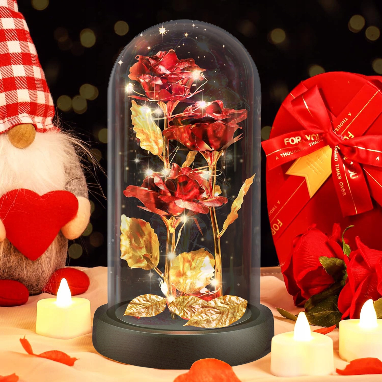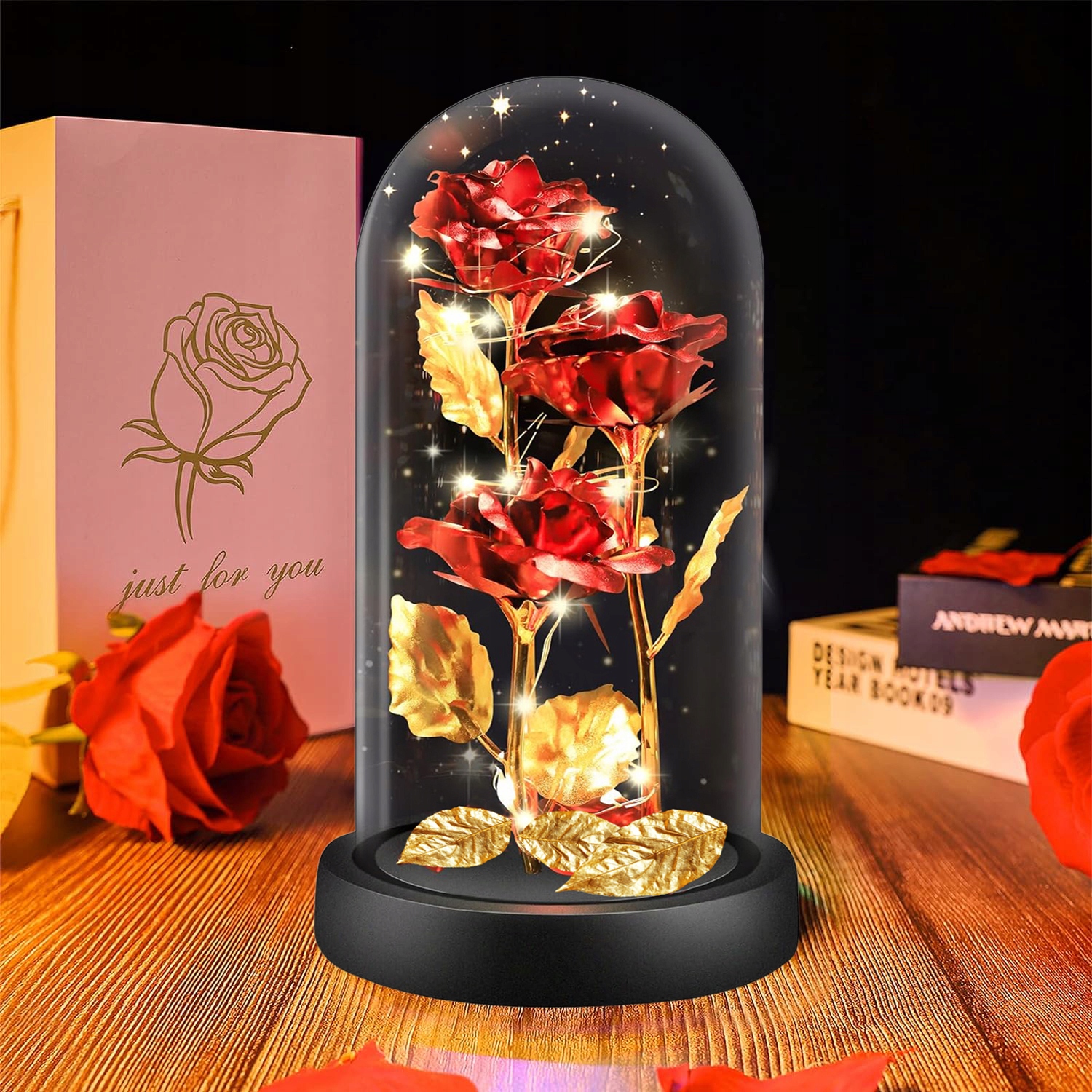 Вся композиция размещена на деревянной основе, что придает подарку элегантный характер. Кроме того, эту базу можно открыть, а под ней есть место для батарей, что позволяет заряжать ее и использовать дополнительное освещение. Это практичное решение, позволяющее адаптировать подарок под собственные предпочтения и создать соответствующий визуальный эффект.