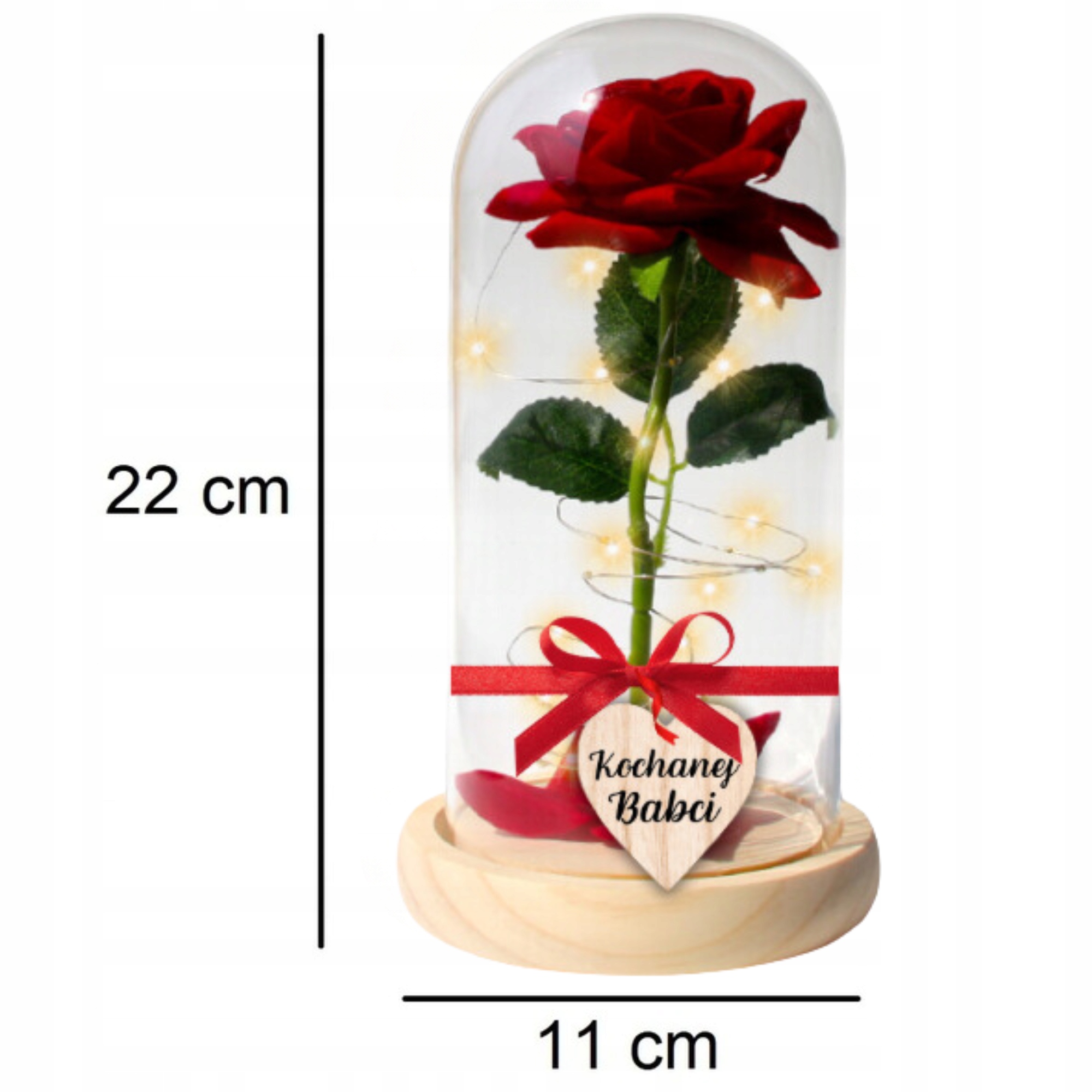 Роза изготовлена из материалов высочайшего качества, а значит, сохранит свое очарование надолго. Помещенный в стеклянный абажур, украшенный теплым светом и нежным сердечком с надписью «Дорогая бабушка», он будет прекрасным украшением и символом вашей любви каждый день.