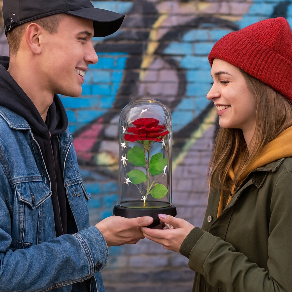 Вечная роза — это тщательно изготовленная искусственная роза, помещенная в стеклянный абажур, часто украшенный нежной светодиодной подсветкой. Он символизирует стойкость чувств и не увядающую красоту.