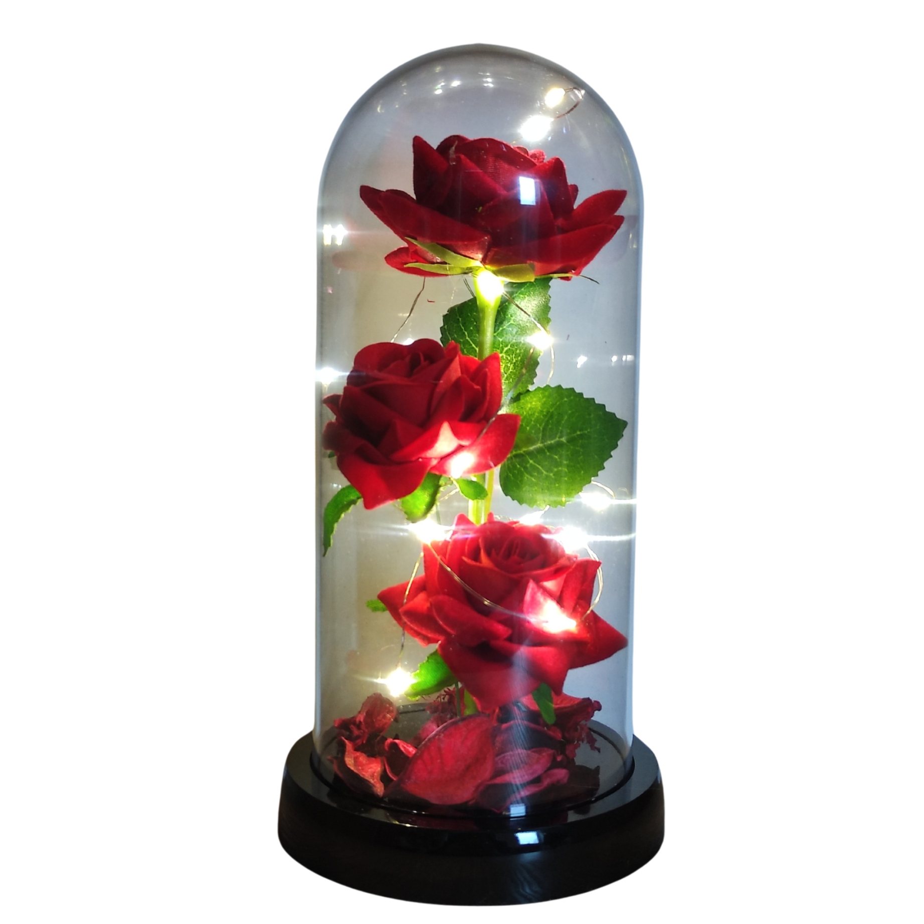 Вы ищете уникальный подарок, который выразит ваши чувства? Вот наша вечная роза в стеклянном куполе, подсвеченная нежными светодиодными лампами. Тройная роза с огоньками – идеальный подарок на любой праздник!