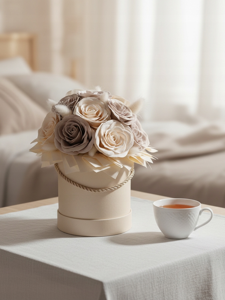 Представьте себе букет, который никогда не теряет блеска, не увядает и радует своим тонким ароматом долгие месяцы. Наша шкатулка из мыльных цветов — это гармоничное сочетание современного дизайна и классической элегантности. Отобранные бутоны в оттенках бежевого, кремового и кофейного латте создают композицию, которая идеально соответствует современным тенденциям дизайна интерьера, таким как стиль бохо, скандинавский стиль или современный минимализм. Это не рядовой подарок – это долговечное украшение, вызывающее улыбку каждый раз, когда вы на него смотрите, избавляющее от проблемы увядания лепестков и необходимости менять воду в вазе.