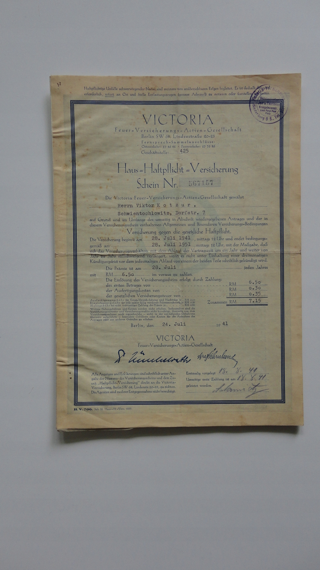 VICTORIA BERLIN ODDZIAL ZABRZE POLISA SWIETOCHLOWICE 1941 ROK