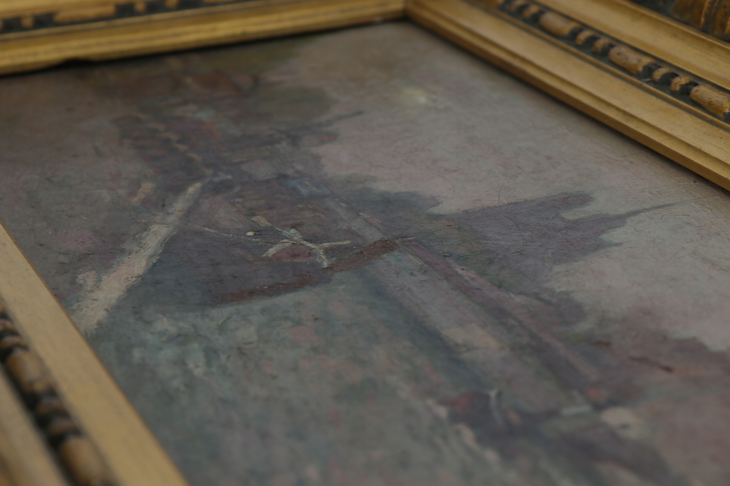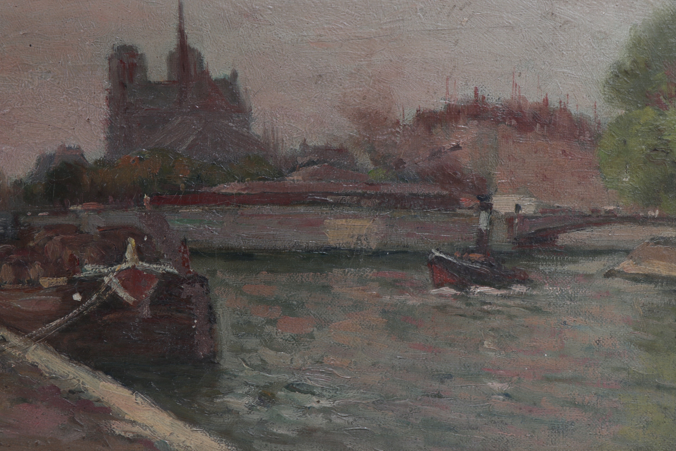 Картина маслом на холсте с видом на собор Парижской Богоматери в Париже с берега Сены порта Монтебелло, слева от собора виден мост Пон-де-л'Аршевеше. Картина подписана, к сожалению, подпись трудно прочесть.