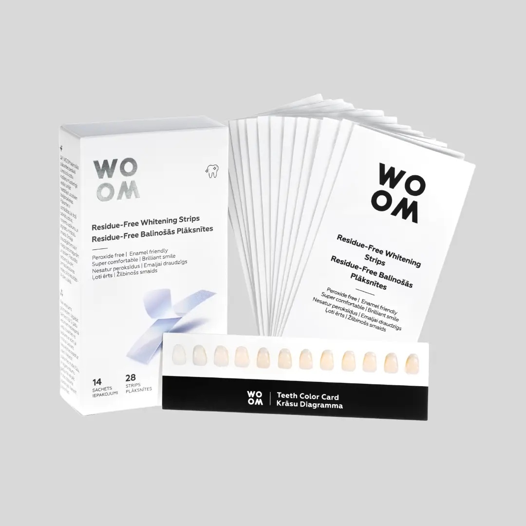 Отбеживающие полоски Woom, современное решение, обеспечивающее превосходное стоматологическое уход и сияющую улыбку. Каждый пакет содержит 28 кусочков деликатных и эффективных отбеливающих ремней, предназначенных для безопасного осветления зубов и удаления бляшки, не оставляя знаков геля. Уход за десен и зубы. Полиакрилат натрия, ксилитол, фталимидопероксикапроновая кислота (PAP), резаудиозид A и ментол. Зубы с полотенцем. Сначала нанесите один отбеливающий ремень к нижним зубам, а затем повторите процесс на верхних зубах. Промойте оставшийся гель, чтобы получить ощущение свежести и чистоты