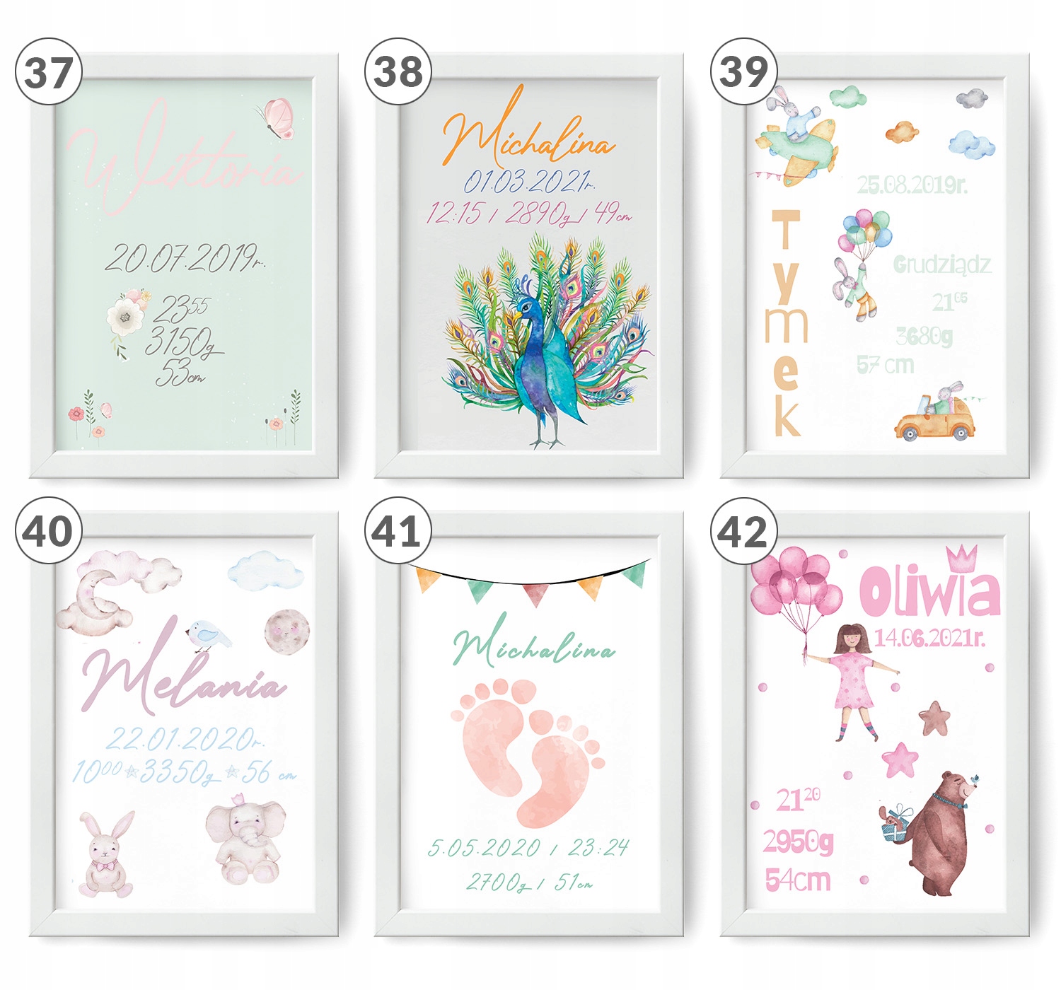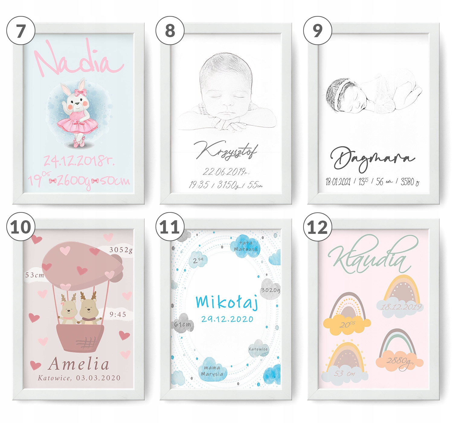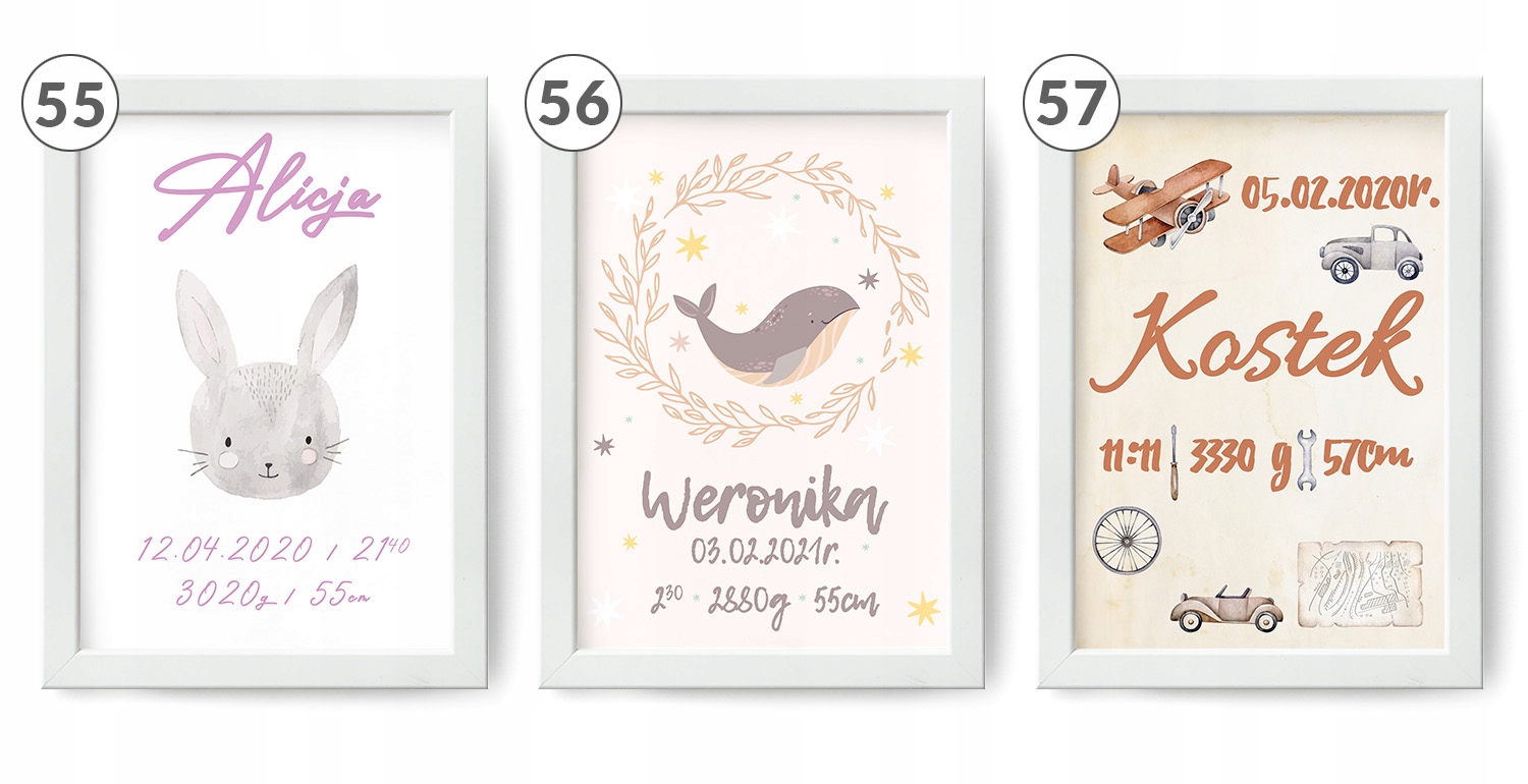 - все информация, указанная в свидетельстве (имя ребенка, вес, рост, дата рождения, время рождения, иногда: место рождения, имена родителей)