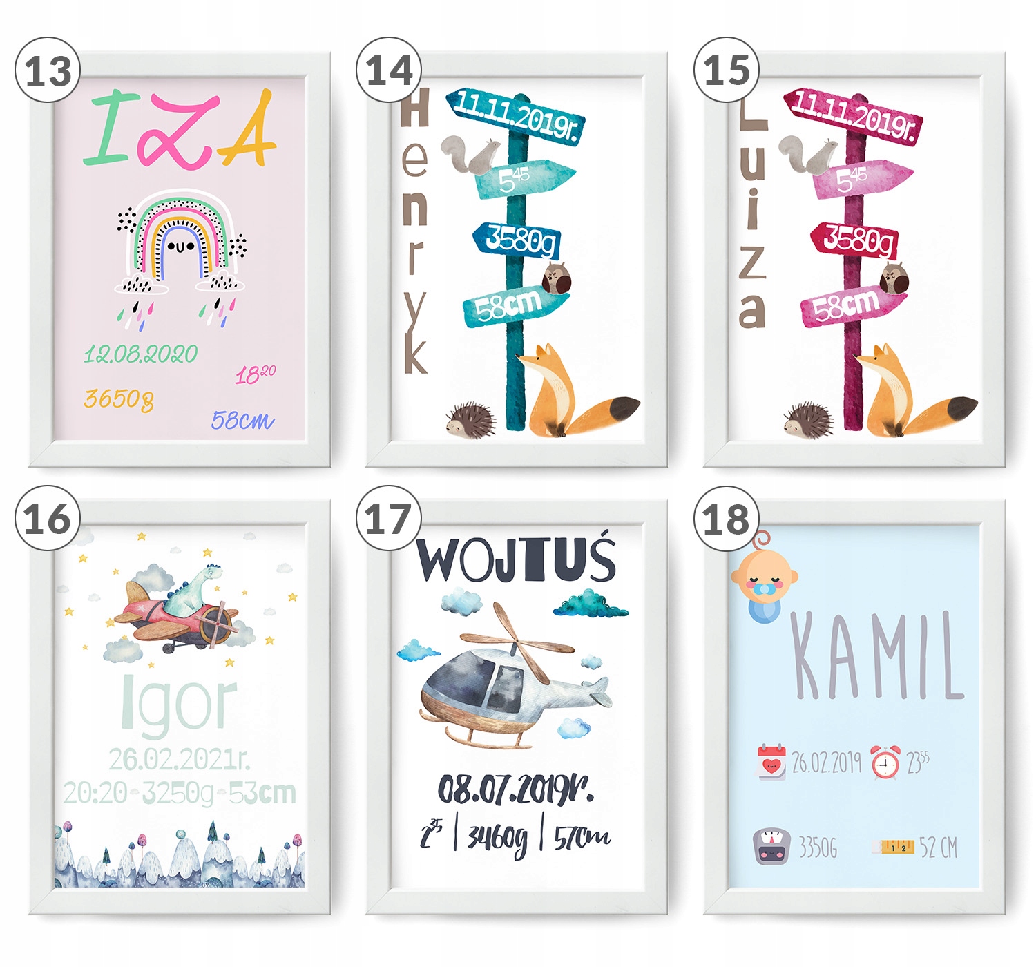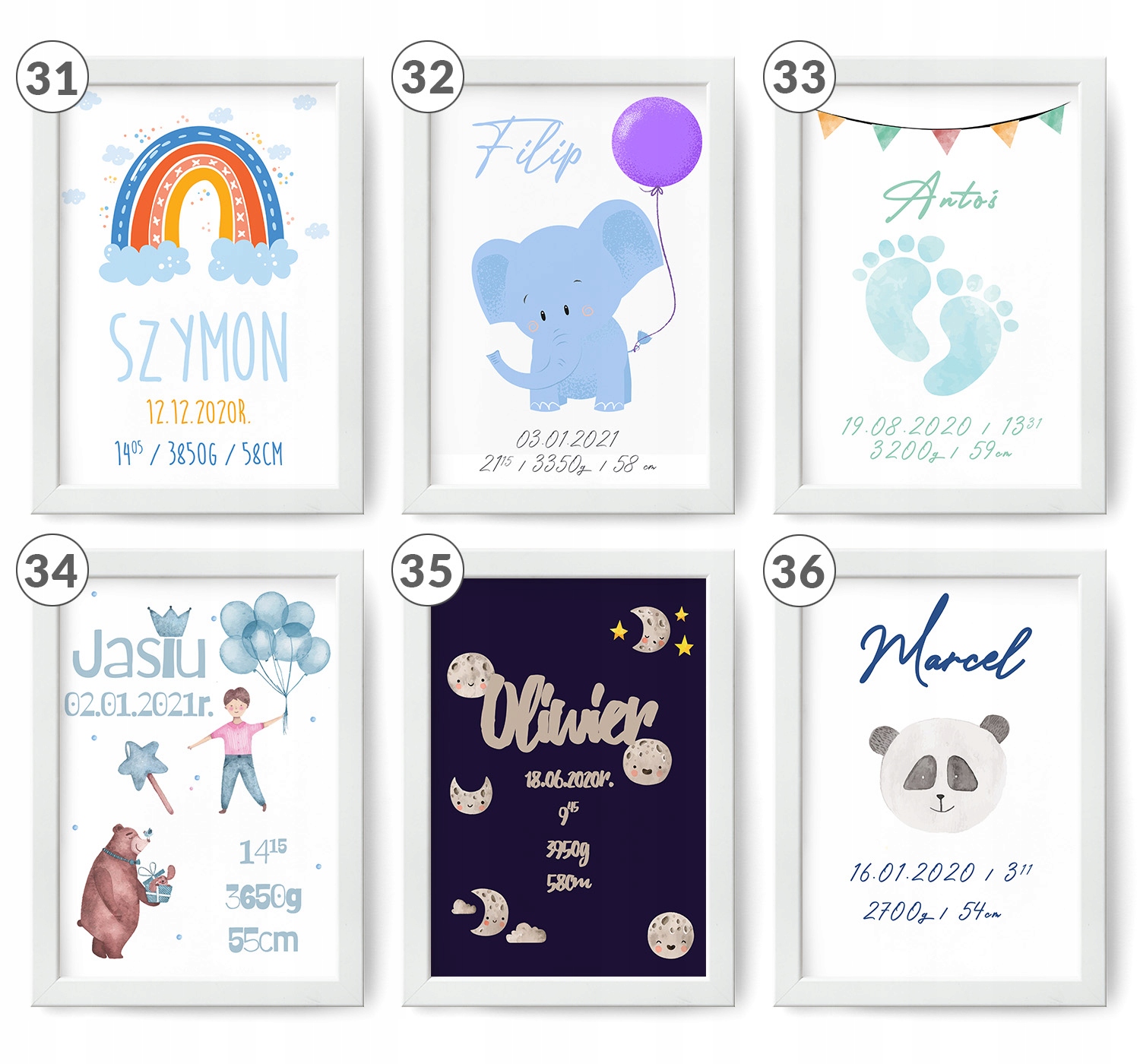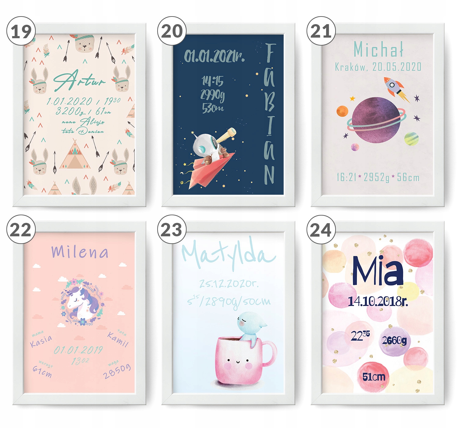 - все информация, указанная в свидетельстве (имя ребенка, вес, рост, дата рождения, время рождения, иногда: место рождения, имена родителей)