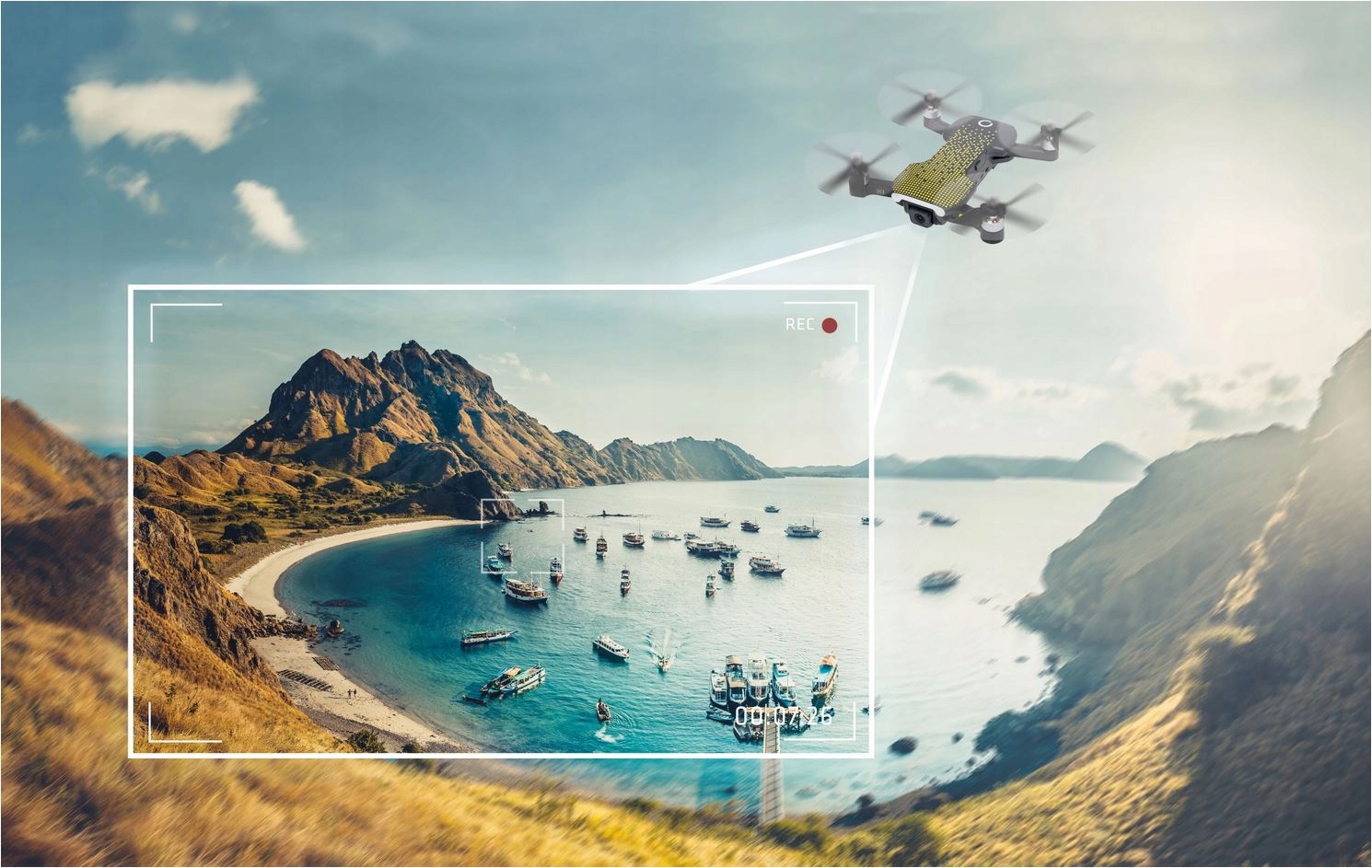 Станьте любителем воздушных приключений! Автоматическая следующая функция Drone с камерой, установленной в сторону оператора. Эта функция особенно полезна при записи спортивных мероприятий нажмите, чтобы летать