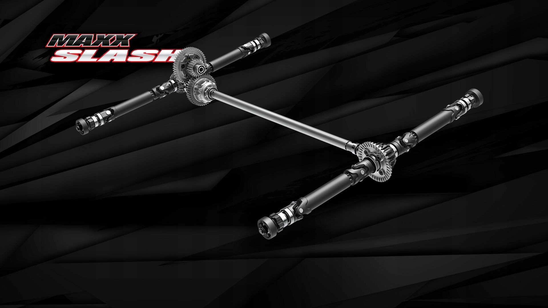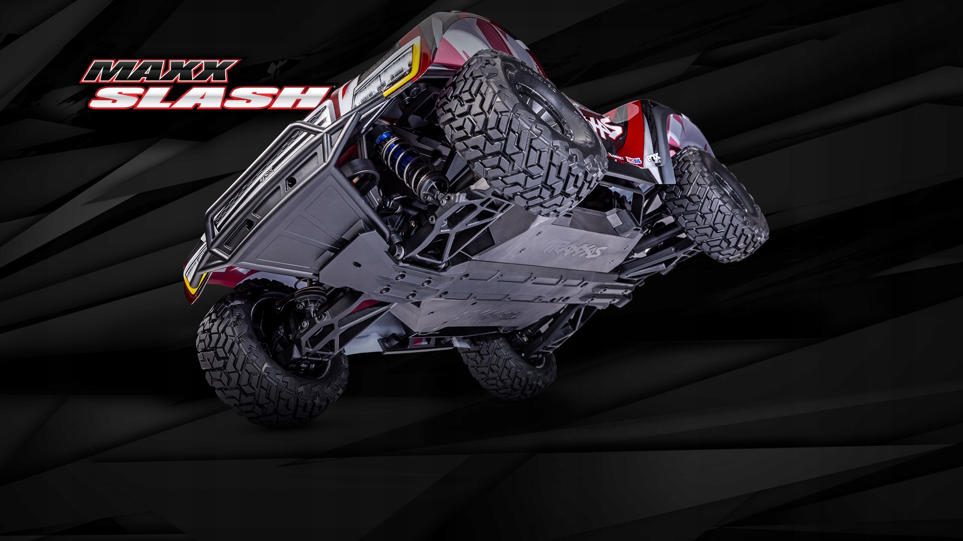 Конструкция шасси Maxx Slash окружает вал среднего привода внутри жесткого скелета, обеспечивая отличную защиту. Очень толстые скользящие пластины связаны друг с другом, обеспечивая чистый вид и езду без каких -либо полевых крючков. Прочные пластины шасси поглощают удары в результате столкновений, защиты наиболее важных элементов системы привода.