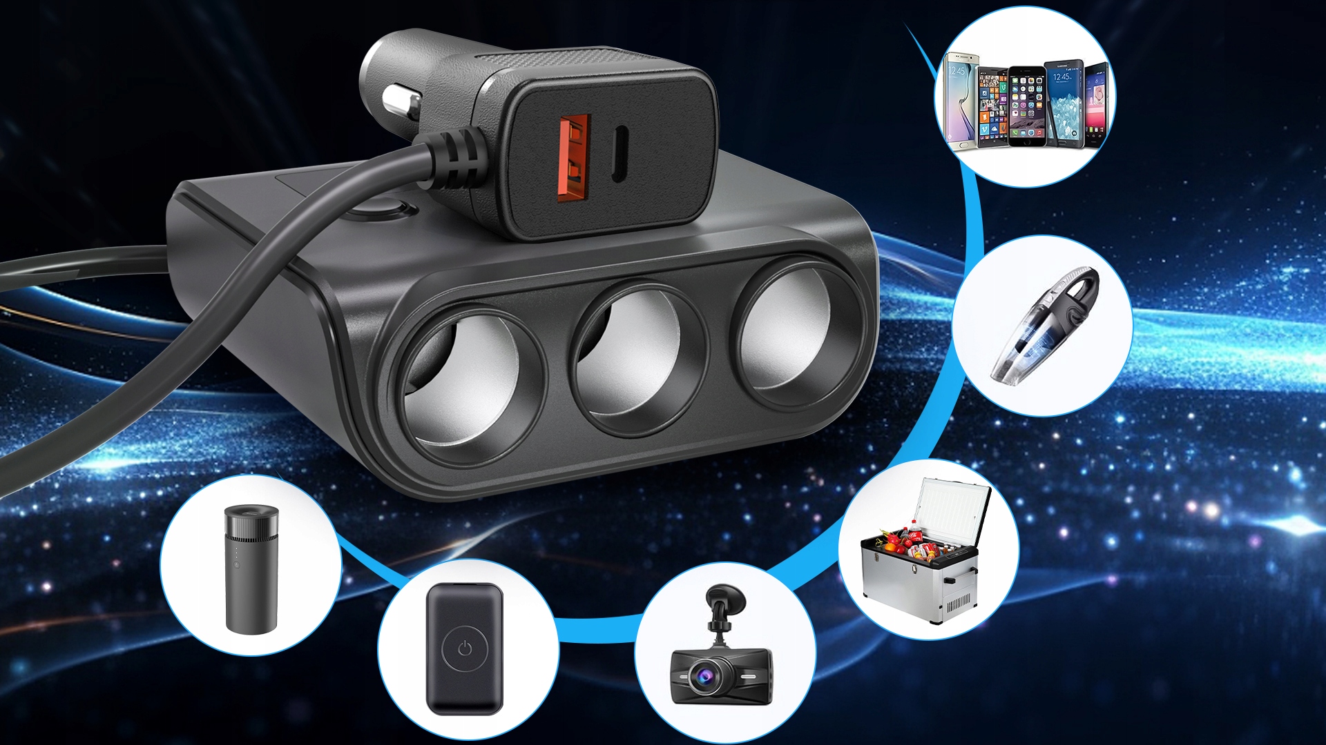 Прозрачный дистрибьютор автомобиля выполняет свою основную функцию, обеспечивая надежный источник питания для электронных устройств в автомобиле. Плагин с легким автомобилем идеально подходит со стандартным розеткой автомобиля. Зарядка различных устройств, в том числе спутниковая навигация, автомобильную камеру, мобильный телефон, мини -вентилятор, чайник, небольшой компрессор, портативная нагревательная подушка и т. Д.