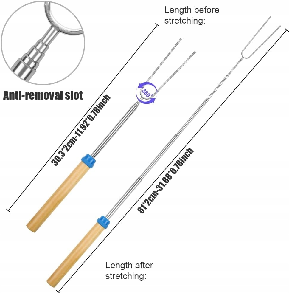 Благодаря выдвижным стержням вы можете с комфортом жарить колбасы, зефир или овощи, сохраняя безопасное расстояние от огня. Закругленные кончики предотвращают случайные проколы, а также безопасны для детей!