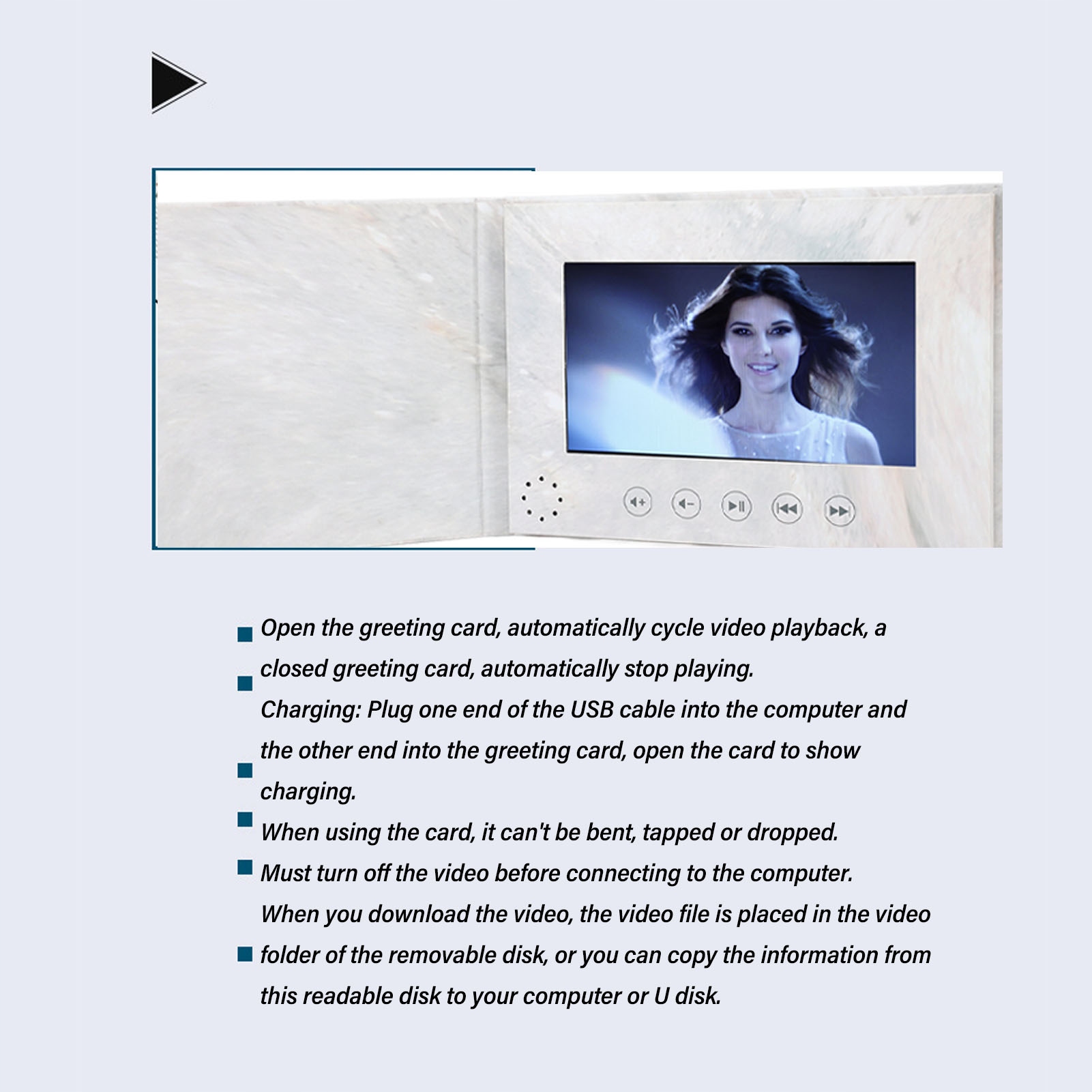 1. Видео высокой четкости: видеооткрытка оснащена 7-дюймовым HD-экраном, обеспечивающим насыщенные цвета, реалистичное изображение и поддерживающим воспроизведение звука, обеспечивающим захватывающее аудиовизуальное впечатление.