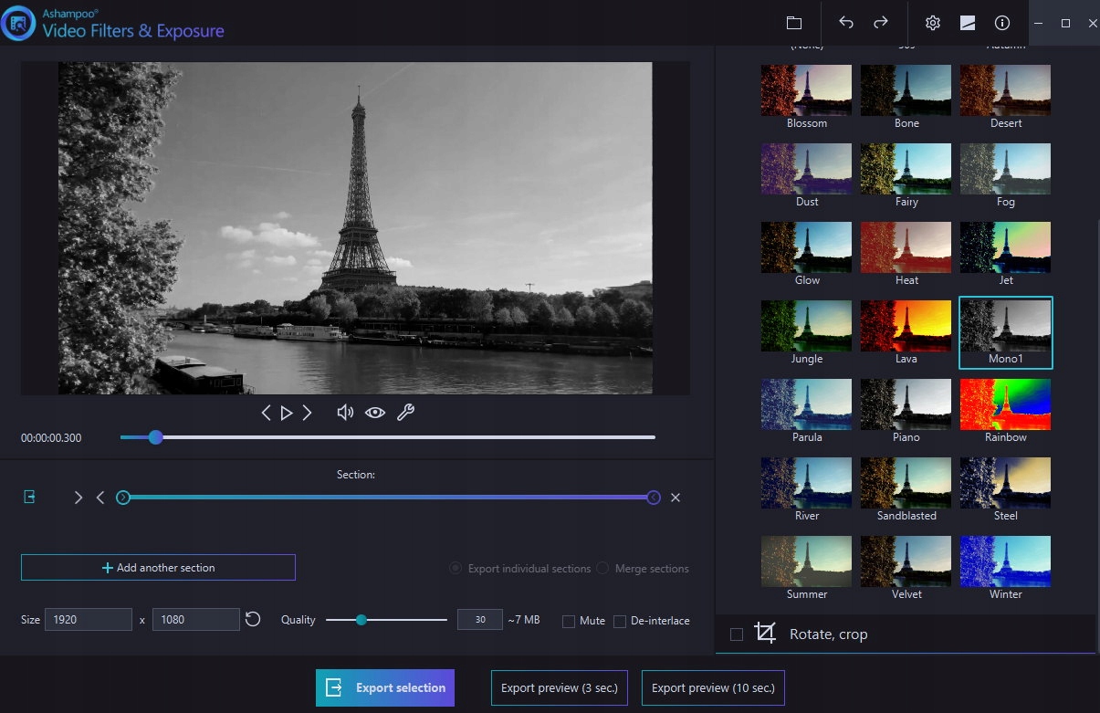 Большая часть видео не выходит идеально в самом начале. Например, у них плохой свет, неестественные цвета или им просто не хватает этого профессионального прикосновения. Фильтры и экспозиция Ashampoo - это интуитивно понятное редактирование видео, которое добавляет стиль к каждому кадру! От простых элементов до настоящего искусства, программа предлагает много функций, чтобы соответствовать выставке и цветам по мере необходимости. Сопоставление баланса белого, экспозиции, тени или освещения с точностью отдельных пикселей или автоматической коррекции тона. Вы можете пойти еще дальше, используя художественные эффекты благодаря 23 -м встроенному - в необычных видео эффектах - от простых снимков и переходов до классического черно -белого с оттенком современности и сияния. Интегрированный живой вид позволяет видеть эффекты без неприятного разочарования. Видеофильтры и экспозиция Ashampoo не только добавляет видео эффектов, но и позволяет вырезать или вращать материал. В обоих направлениях (90 ° / 180 ° / 270 °) и по любому углу. Традиционная обрезка или формат и разрешение. Видеофильтры Ashampoo и импорт экспозиции все самые популярные видео форматы в любом разрешении, включая HD, 2K и 4K. Белый