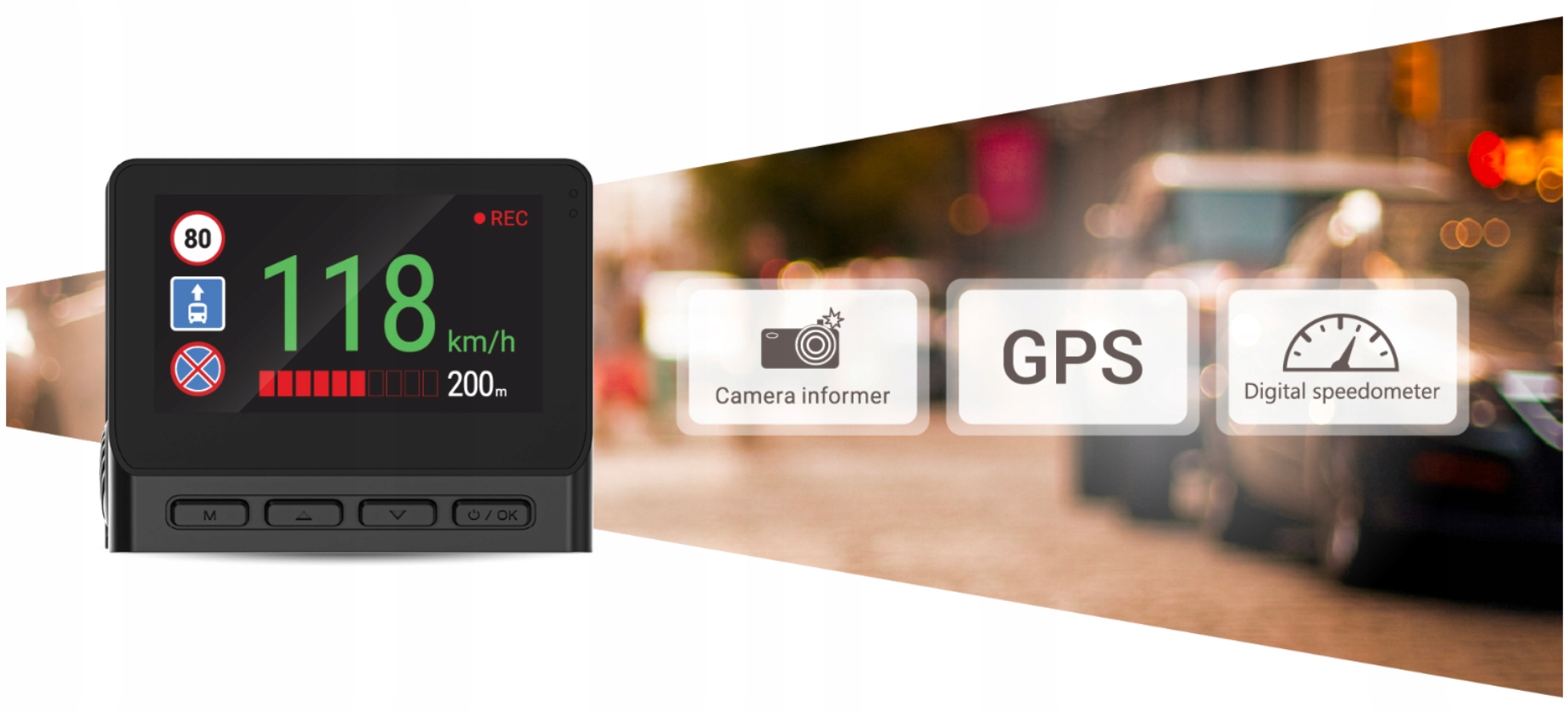 Благодаря встроенному модулю GPS, видео -рекордер не только экономит маршрут вашего путешествия, но и информирует вас о ограничениях скорости и камерах скорости. Функция цифрового спидометра показывает скорость тока на постоянной основе и предупреждает о важных моментах на маршруте.