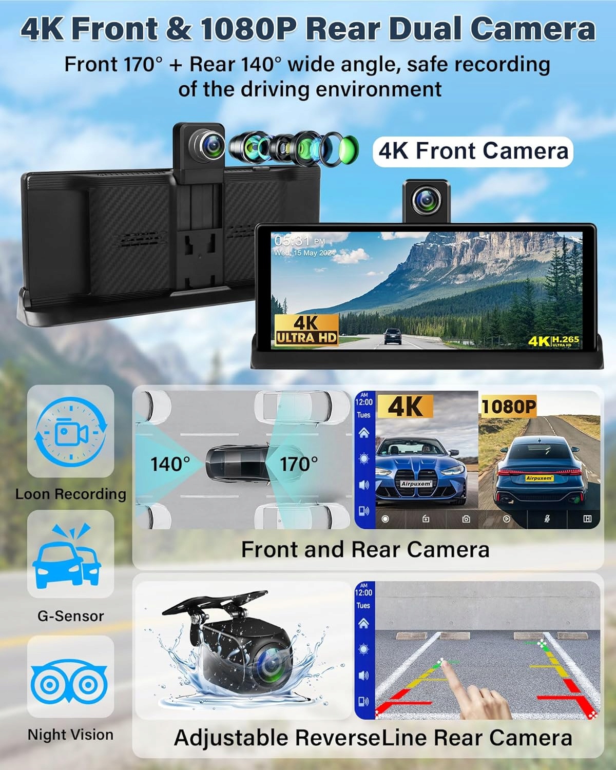 - Вращающаяся на 350° камера 4K с передней панелью:Беспроводной экран Carplay оснащен передней камерой 4K HD и задней камерой 1080P, которая поддерживает циклическая запись и ночное видение HD. Двойная камера вождения записывает видео одновременно, обеспечивая широкое поле обзора и записывая ваше путешествие безопасно, четко и точно. Вы можете расположить переднюю камеру вертикально, чтобы она соответствовала креплению вашего автомобиля, и повернуть ее на 350 °, чтобы записать сцену внутри автомобиля или за окном для удобного просмотра задних сидений и вида сбоку.