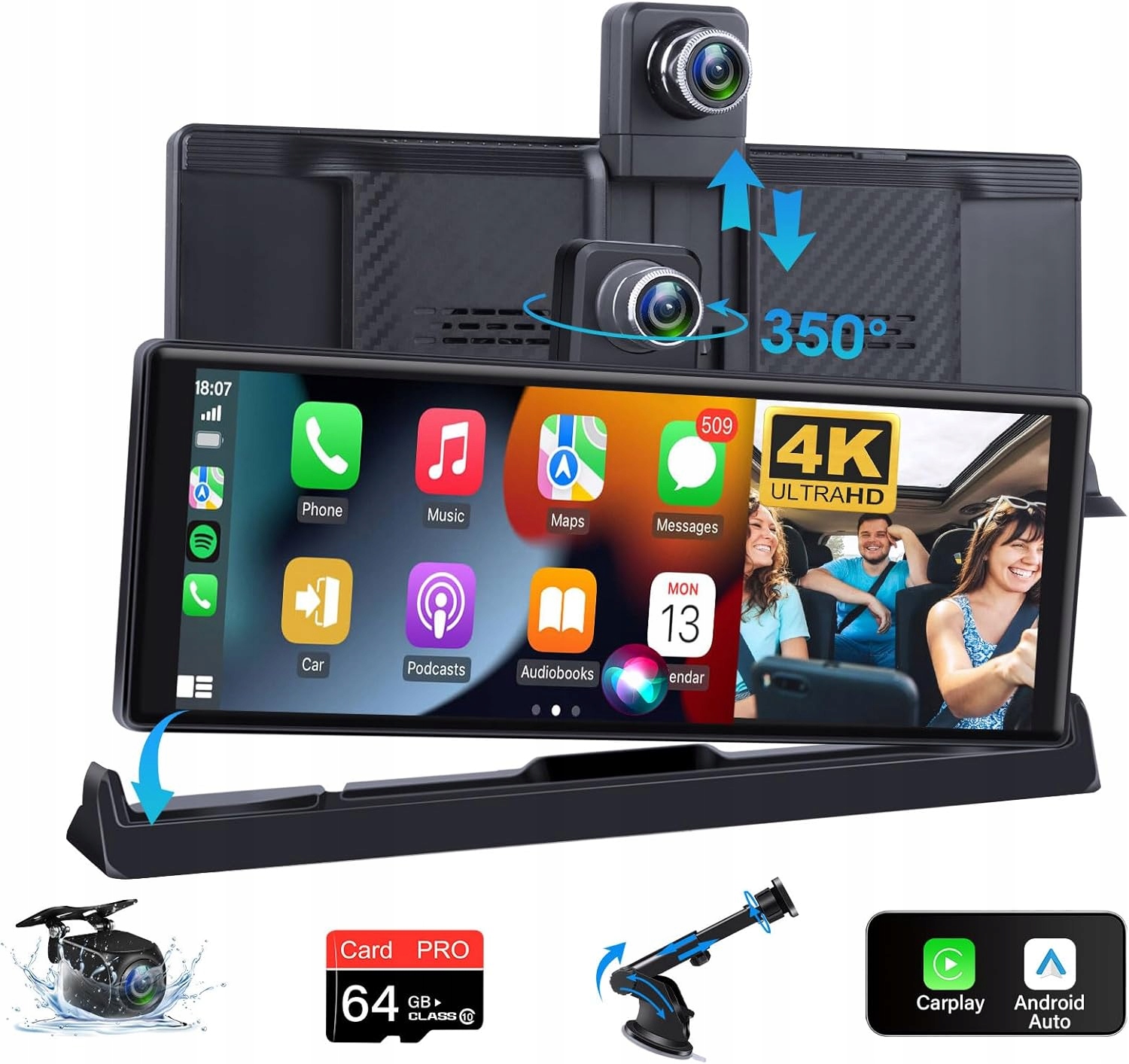 Поворотный на 350° беспроводной дисплей Carplay с системой Android, дисплей Carplay 10,26 дюйма с приборной камерой 4K, спереди, устойчивый держатель для автомобильного дисплея с системой.