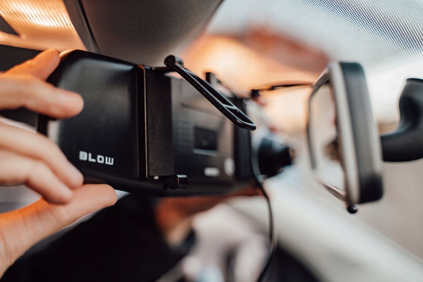 Новый автомобильный видеорегистратор BLOW BLACKBOX F600 FULL HD, камера в зеркале заднего вида, камера заднего вида для установки в задней части автомобиля, жгут проводов для камера заднего вида, прочные монтажные кронштейны, регулируемый держатель для имеющегося зеркала заднего вида, благодаря которому камеру можно установить в любой автомобиль, автомобильное зарядное устройство с вилкой прикуривателя 12В/24В, USB-кабель, руководство пользователя на польском языке, оригинальная упаковка из серии BLOW CAR CAM