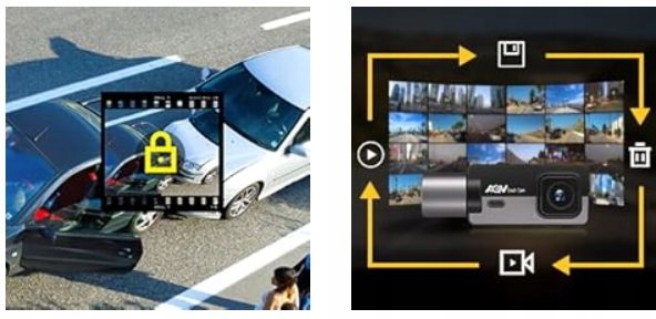 В случае столкновения автомобиля моторная камера может автоматически сохранять и блокировать фотографии, сделанные для использования в качестве доказательства в случае аварии. Автомобиль с автомобильной камерой хранит видео в бесконечной цикле на карте Micro SD и удаляет разблокированные фильмы после заполнения памяти. Dash Cam поддерживает максимум 128 ГБ карты, а AQV распределяет 32 ГБ карту.
