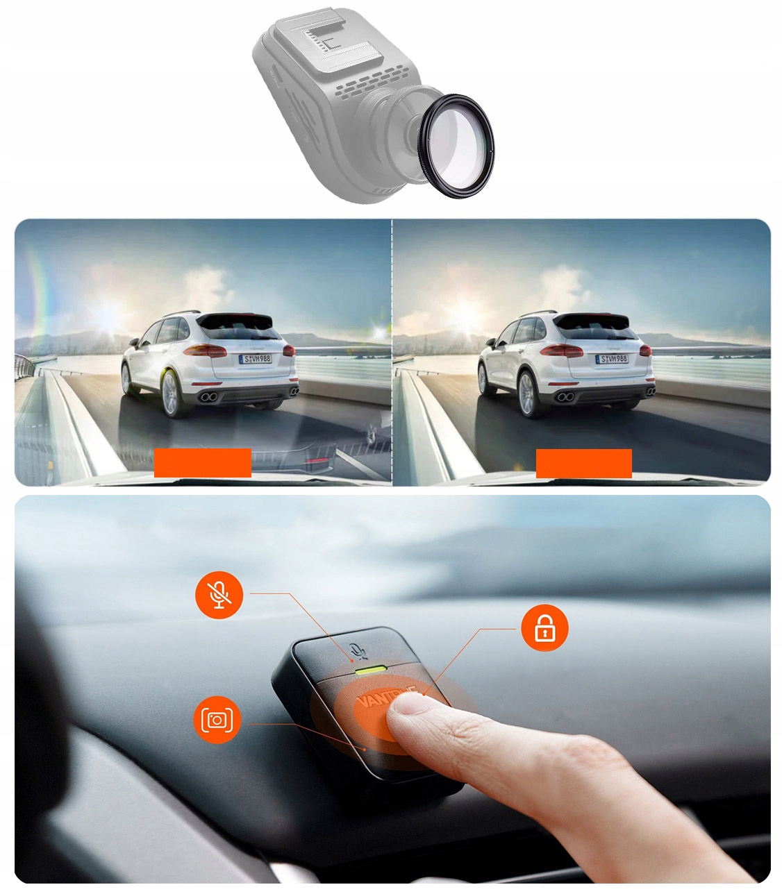 С Vantrue S1 PRO MAX вы можете расширить возможности устройства — установить CPL-фильтр, уменьшающий отражения, или использовать Пульт дистанционного управления Bluetooth для быстрой блокировки записи. Все для еще большего комфорта.