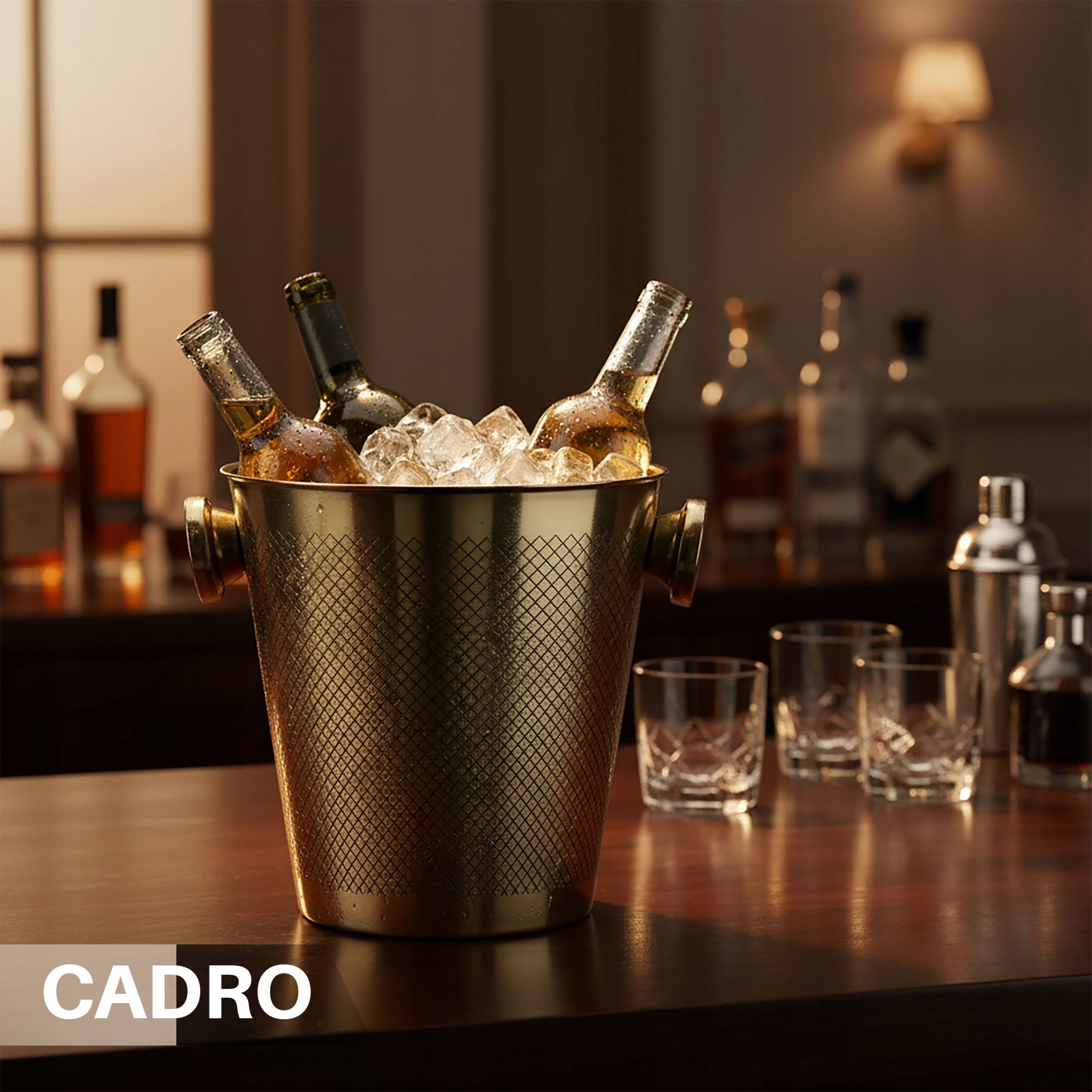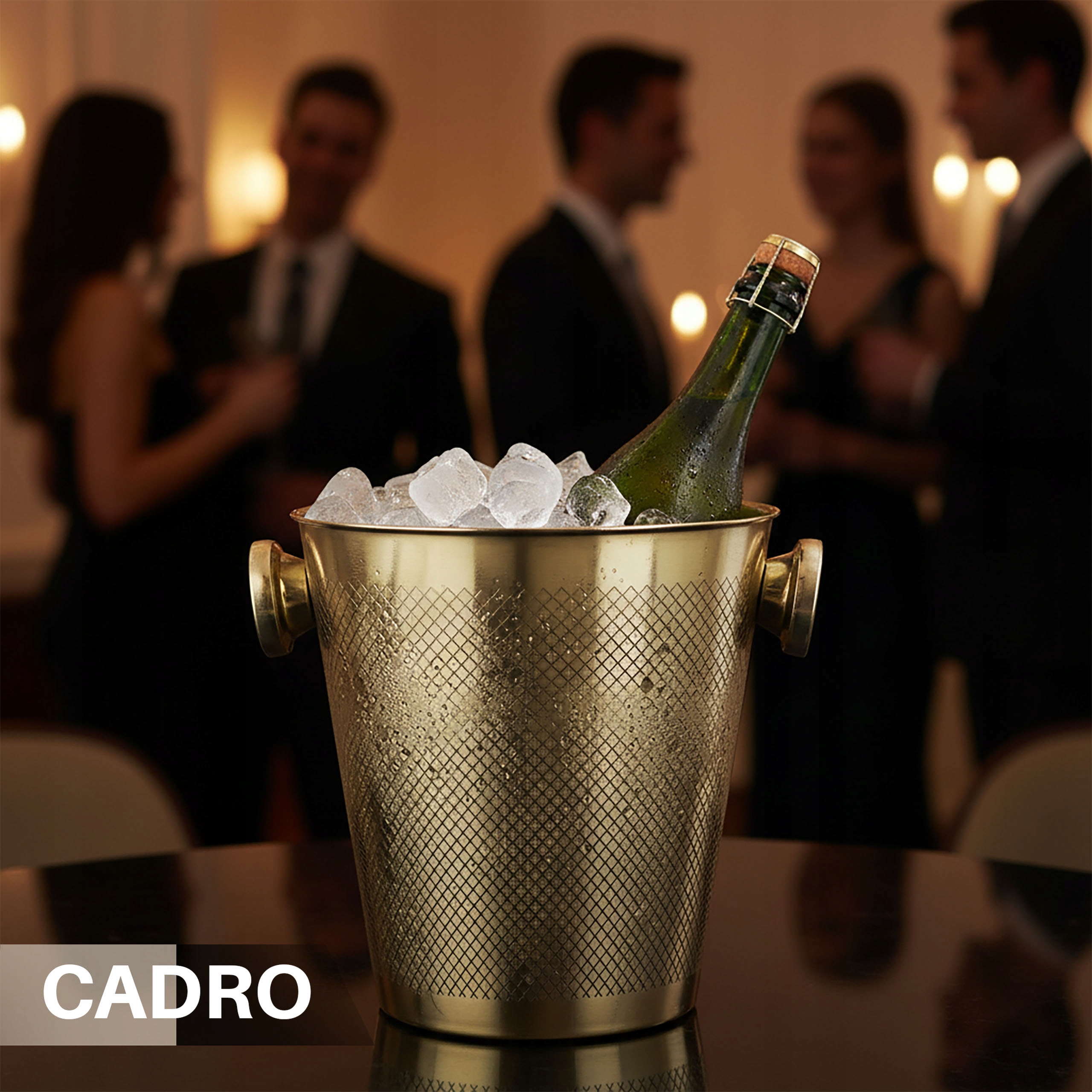 Подчеркните уникальность каждого торжества с помощью этого эксклюзивного холодильника для шампанского или вина! Изготовленный из высококачественной нержавеющей стали (201) роскошного золотого цвета, он является незаменимым элементом элегантного стола. Ведро отличается современным узором из квадратов на глянцевой внешней поверхности и практичной матовой отделкой внутри. Обеспечивает длительное охлаждение любимых напитков.