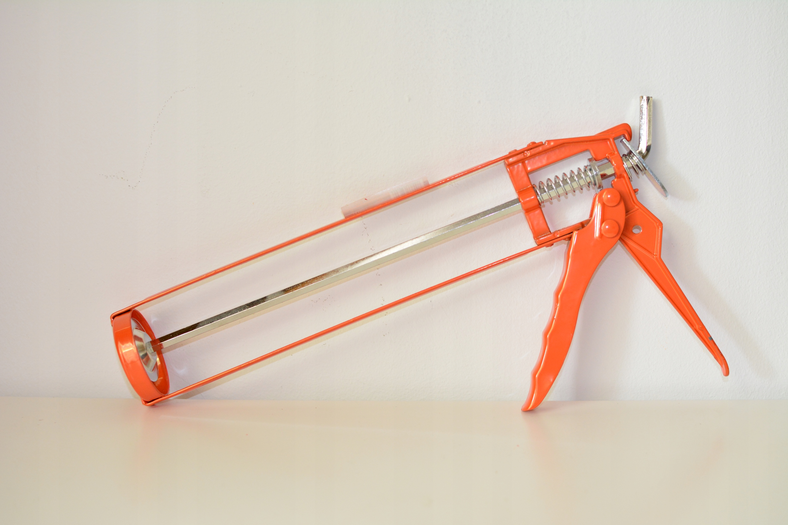 Пистолет-скелетон оранжевого цвета для нанесения силиконов, полиуретановых масс, акрила, монтажных клеев в тюбиках и картриджах емкостью от 270 до 310 мл.