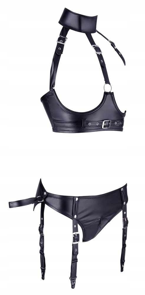Захватывающий, открытый бюстгальтер и сложный инжир включены. Ремень под бюстом и воротниками регулируются для идеально подходящего. У трусиков есть двухсторонний замок в промежности и модный шар над ягодицами. 4 Стоковые полосы также регулируются. Прикрепленные наручники, закрепленные на липучке, могут быть прикреплены по бокам трусиков с помощью колец. 90% полиэстер, 10% эластан. Установить без чулок.