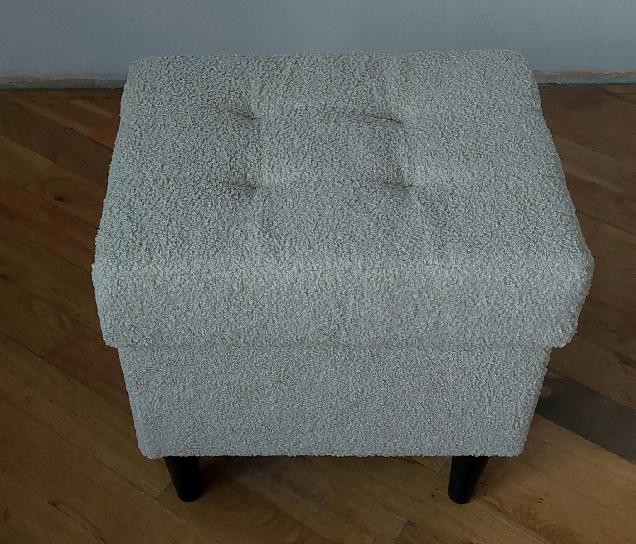 Пуф имеет 4 ножки следующих цветов: белый, натуральное дерево, коричневый или черный (сообщите, пожалуйста, выбранный цвет пуфа)