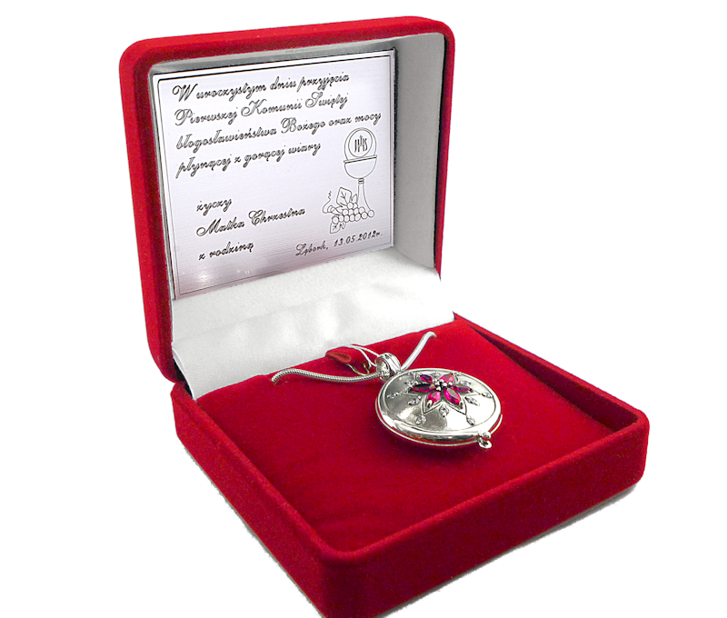 Кулон упакован в элегантную коробку (красный или синий темно -синий цвет) с дополнительной посвящением с пожеланиями по случаю первого святого причастия