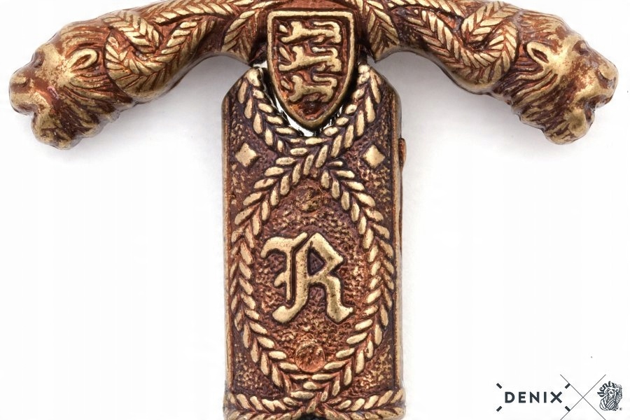 Представляем нож для писем в элегантных ножнах, который представляет собой миниатюрную копию меча Ричарда Львиное Сердце. Лезвие изготовлено из выдувной, незакаленной, блестящей хромированной стали. Рукоять изготовлена из цинкового сплава, украшена стилизованными львами. Ножны обтянуты коричневой искусственной кожей и украшены фурнитурой в форме льва. Он красиво украсит любой офис и станет отличным подарком.