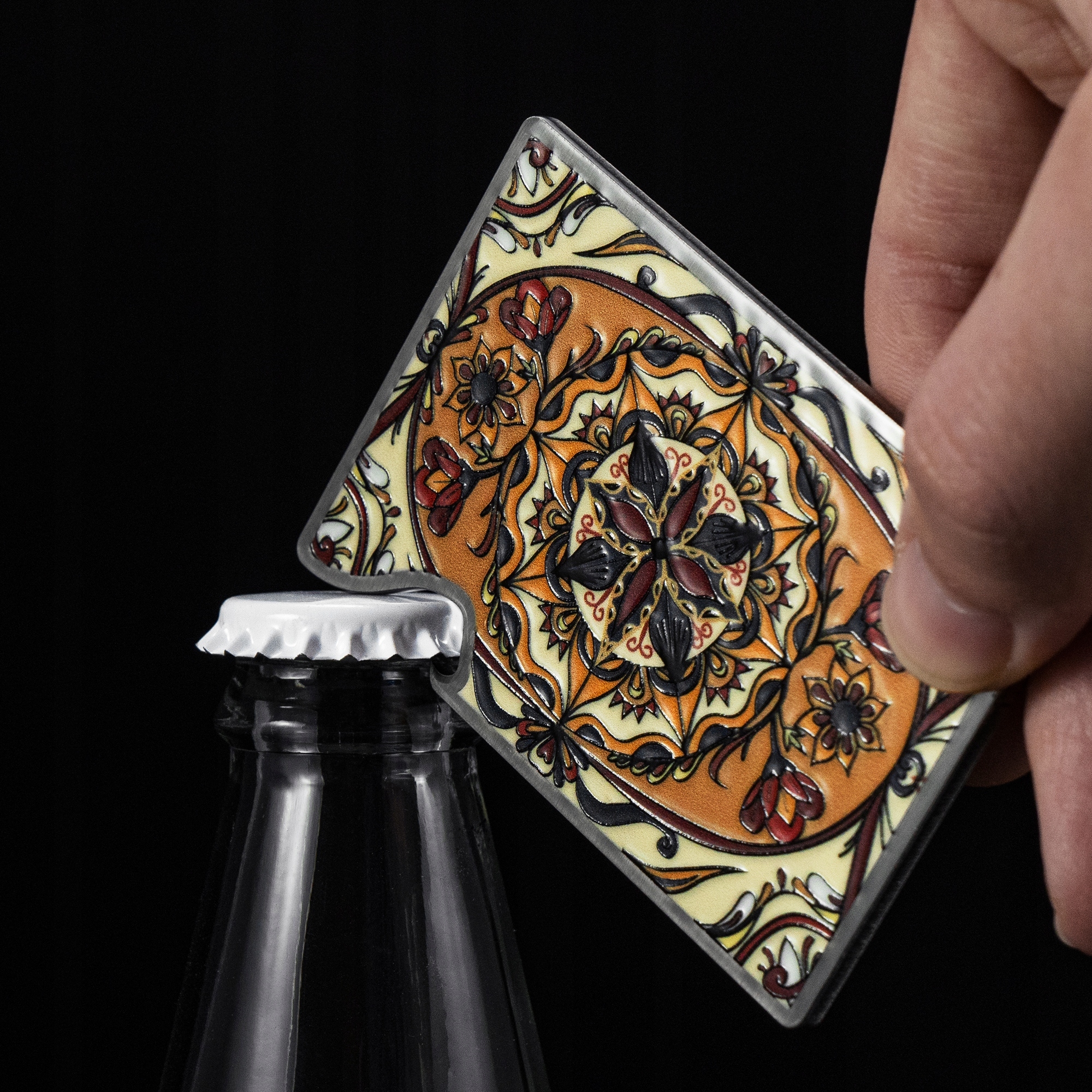 На аверсе - сложный узор, реверс стилизован под игральную карту. Подобная конструкция привлечет внимание ваших жаждущих друзей. Покажите им, как совместить эстетику и функциональность! Вы можете открыть бутылку легко и быстро. Вытащив такой козырь в рукаве, вы спасете вечеринку на свежем воздухе, ведь ваш друг, скорее всего, как обычно забудет нож. Выбор широк — доступно несколько дизайнов.