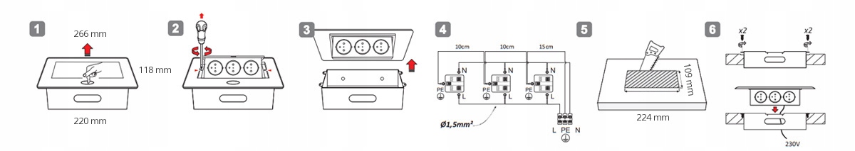 - Рекомендуемый размер отверстия в столешнице: 109 x 224 мм.