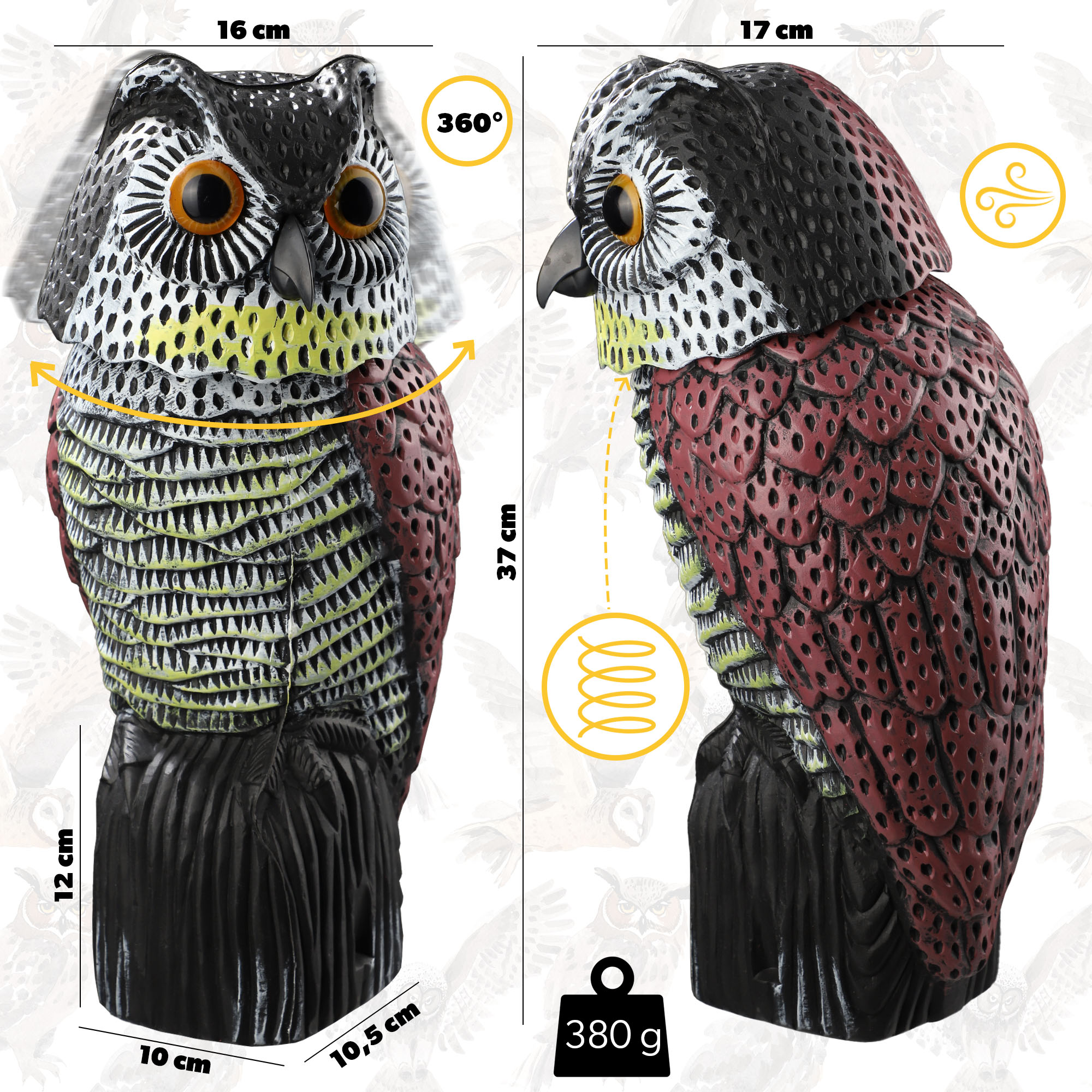 ✅РАЗМЕРЫ – Точное воспроизведение совы с подвижной головой подчеркивает ее размеры. Высота 37 см, ширина 17 см и толщина 16 см создают реалистичный внешний вид отпугивателя.