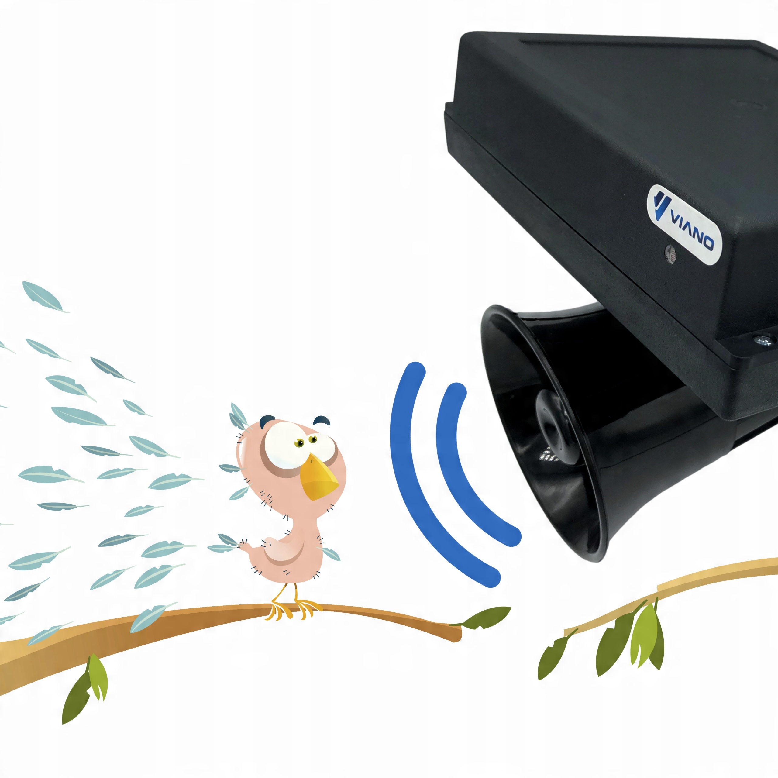 viano® Bird Repeller будет управлять великолепными в садах, виноградниках, плантациях и пахотных полях. Устройство имеет возможность включать и, что важно, установить функцию излучения звука через определенные интервалы (вредители, слушающие издалека, звуки хищных птиц не летают возле охраняемого пространства).