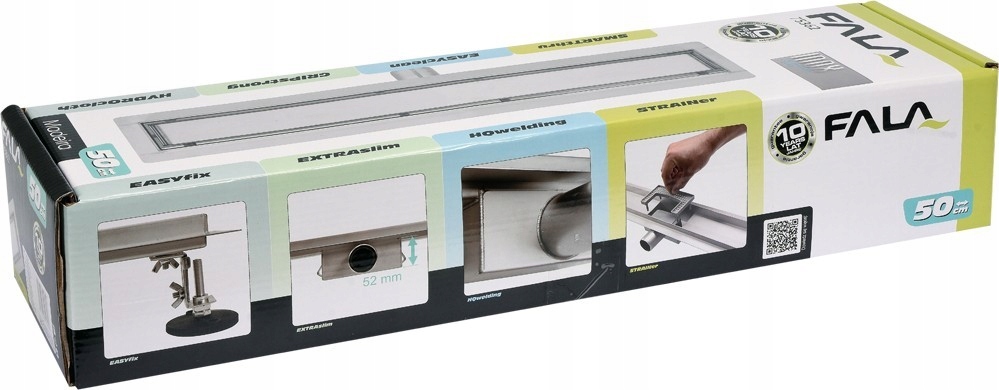 <р> Он изготовлен полностью из нержавеющей стали AISI 304, которая отличается устойчивостью к коррозии, моющим средствам и механическим повреждениям. <р> Душевые трапы Fala оснащены оборудованием, гарантирующим комфортную и эффективную работу на долгие годы: <р> - SMARTthru – специальное смотровое окошко означает 100% контроль проходимости и удобную очистку: <р> - EASYclean – легко содержать в чистоте благодаря крючку, входящему в комплект: <р> - GRIPstrong – ручки, стабилизирующие корпус, дополнительное придание жесткости конструкции в полу: <р> - HYDROcloth – уплотнительный коврик входит в комплект – необходимая деталь для гидроизоляции: <р> - STRAINer – эффективное и долговечное сито, предотвращающее засорение сифона и облегчающее постоянную эксплуатацию слива: <р> - HQwelding – качественные прецизионные сварные швы, гарантирующие герметичность слива: <р> - EXTRAslim – изготовлен из нержавеющей стали AISI 304 с очень низким сифоном, что облегчает установку: <р> - EASYfix – широкий диапазон регулировок по высоте, позволяющий подстроить слив под поверхность пола. <р> Вы можете установить водосток Фала без забот — на все наши водостоки предоставляется гарантия 10 лет! <р> Данные: <р> - длина желоба: 50 см <р> - рисунок сетки – Мадейра (плитка под приклеивание) <р> - материал: нержавеющая сталь AISI 304 <р> - ширина: 70 мм (дополнительно воротник примерно по 2 см с каждой стороны) <р> - высота сифона: 52 ммЦель/использование