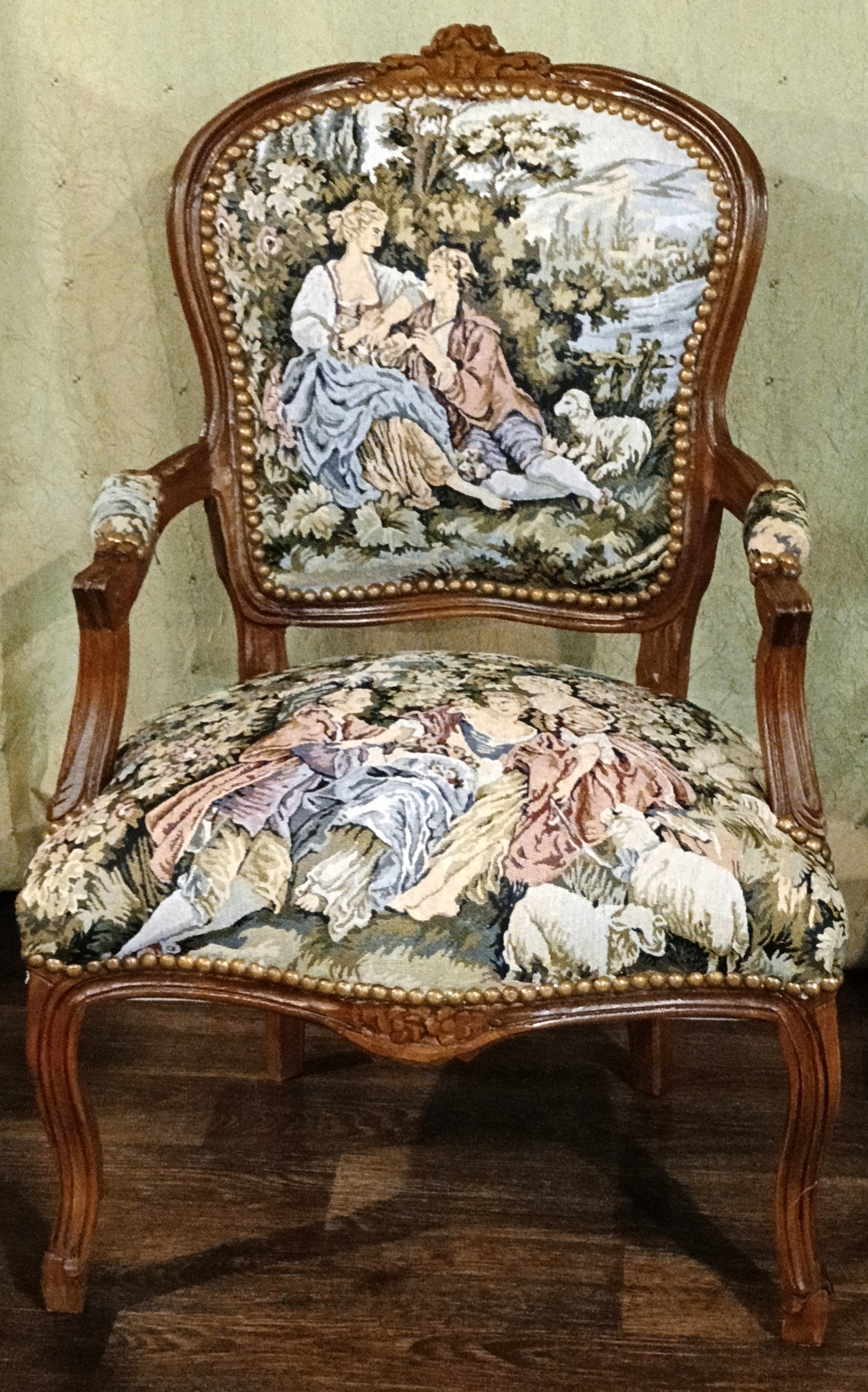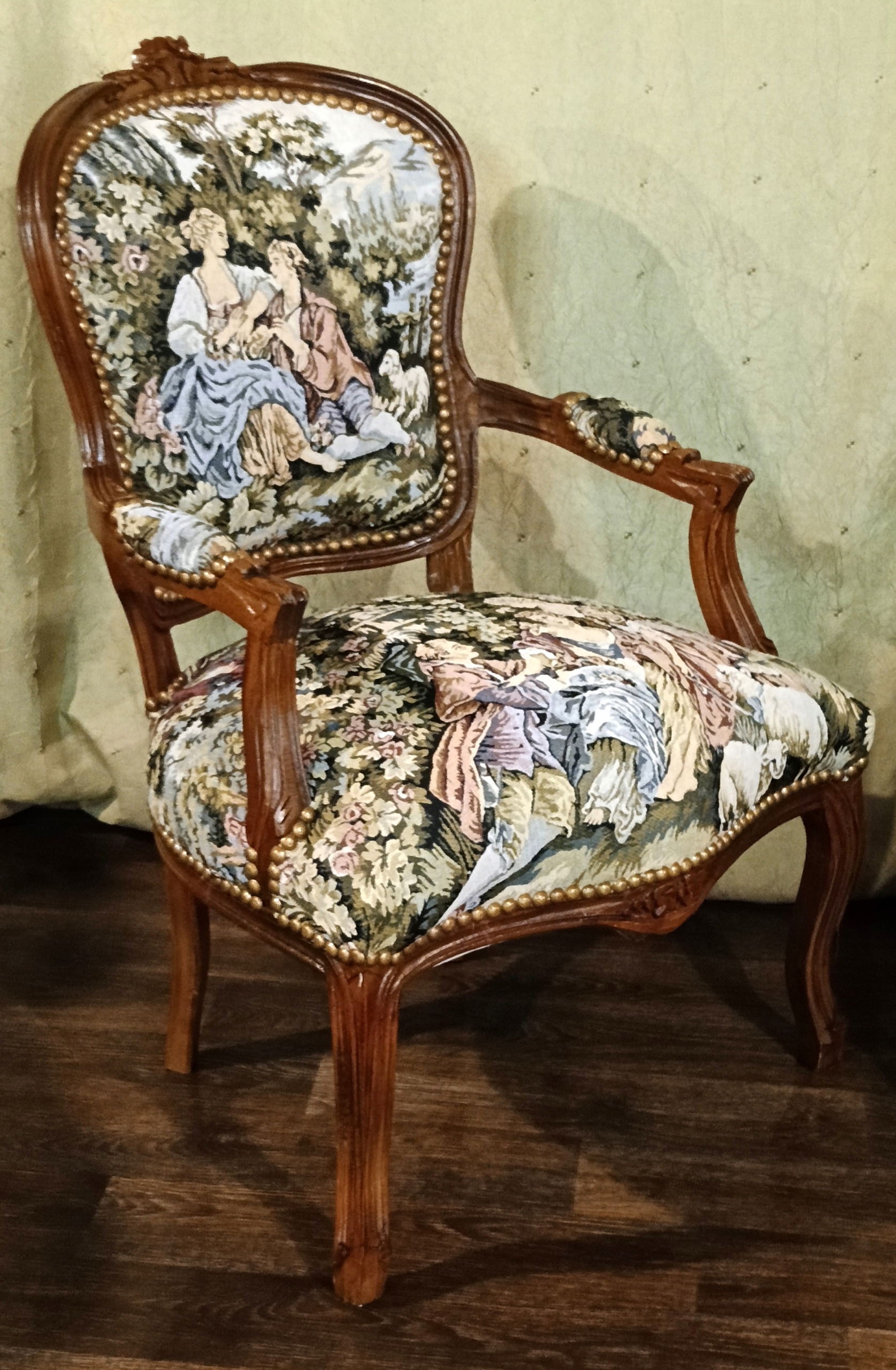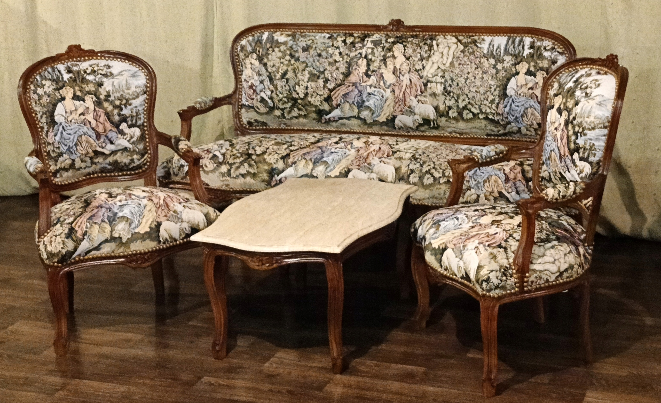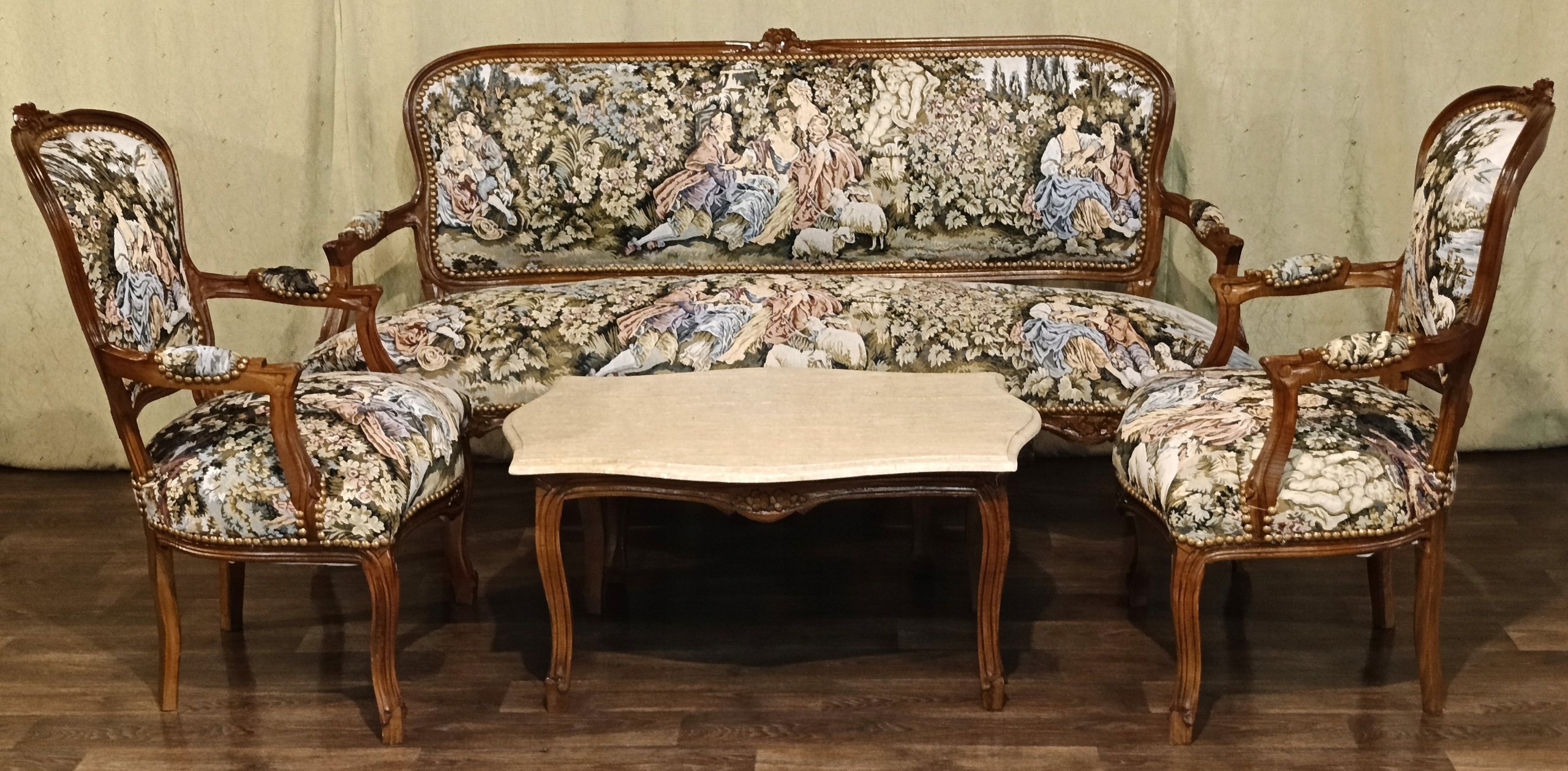 Coffee Recreation h1> Набор включает в себя: диван, два кресла и скамейку с мраморной вершиной песка. Темный орех дерево. Обинка, сделанная из гобелена с мотивом судебных форм. Эффективная отделка обивки - декоративная Pineska - очень хорошее состояние. h1> Салон выглядит красиво и определенно добавит привлекательность в вашей семье. Идеально подходит для питья кофе, чая или хозяина друга. Сиденья 50 см, высота до сиденья 45 см.