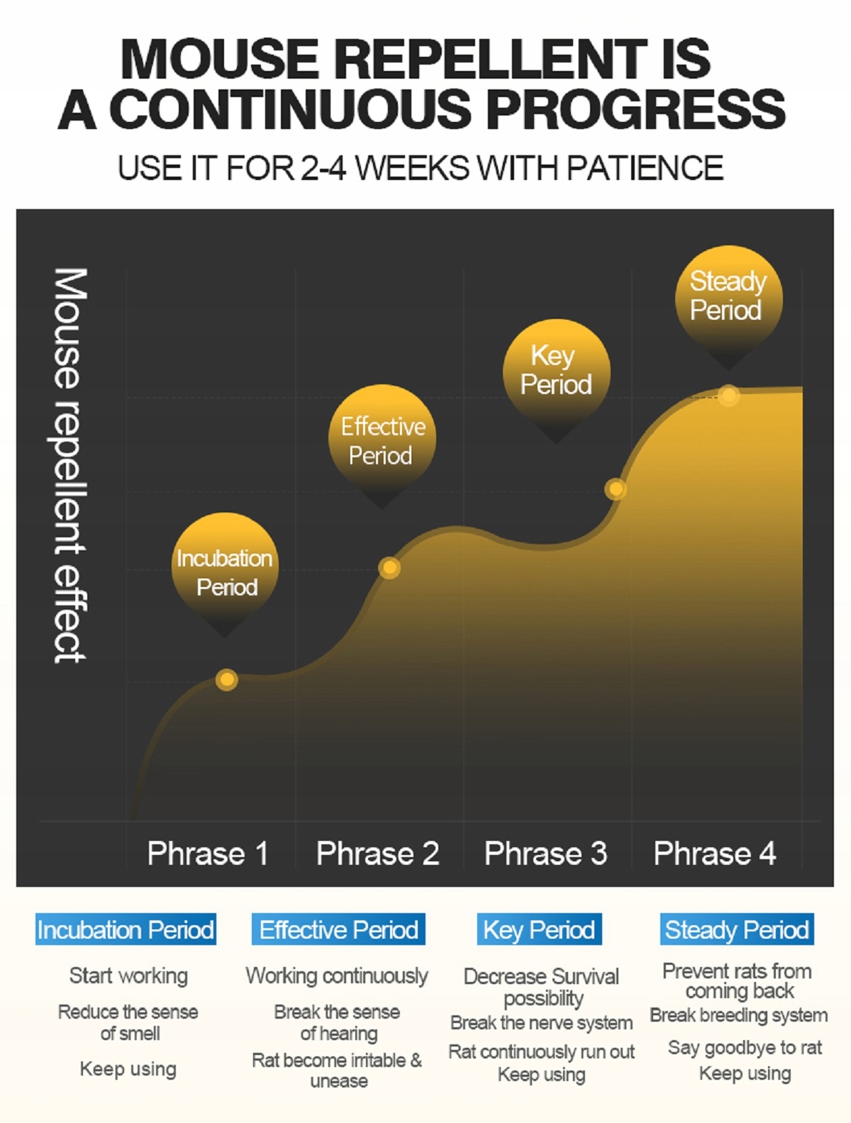 Второй этап. Эффективный период сдерживания. Раздражение слуха. Крыса становится раздражительной или ее активность нормализуется. Пожалуйста, продолжайте использовать.