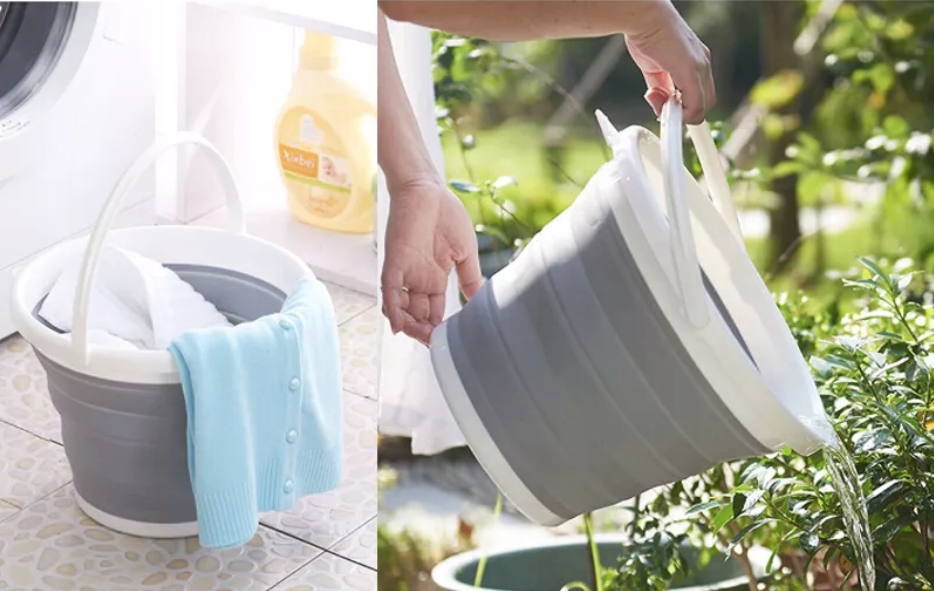 Складное ведро b> - сенсационная вещь, полезная в каждом доме. Он был изготовлен из прочного и толстого силикона, а дно и верхний прочный пластик.