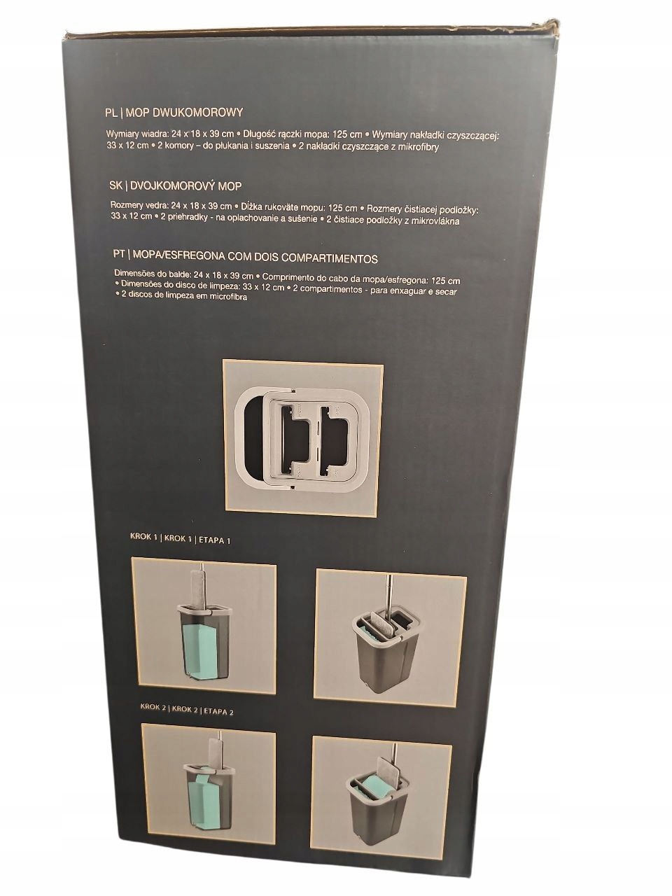 В комплекте: плоская швабра с вращающейся насадкой для уборки труднодоступных мест, 2 подушечки из микрофибры, ведро с двумя камерами для чистой воды и местом для слива воды.