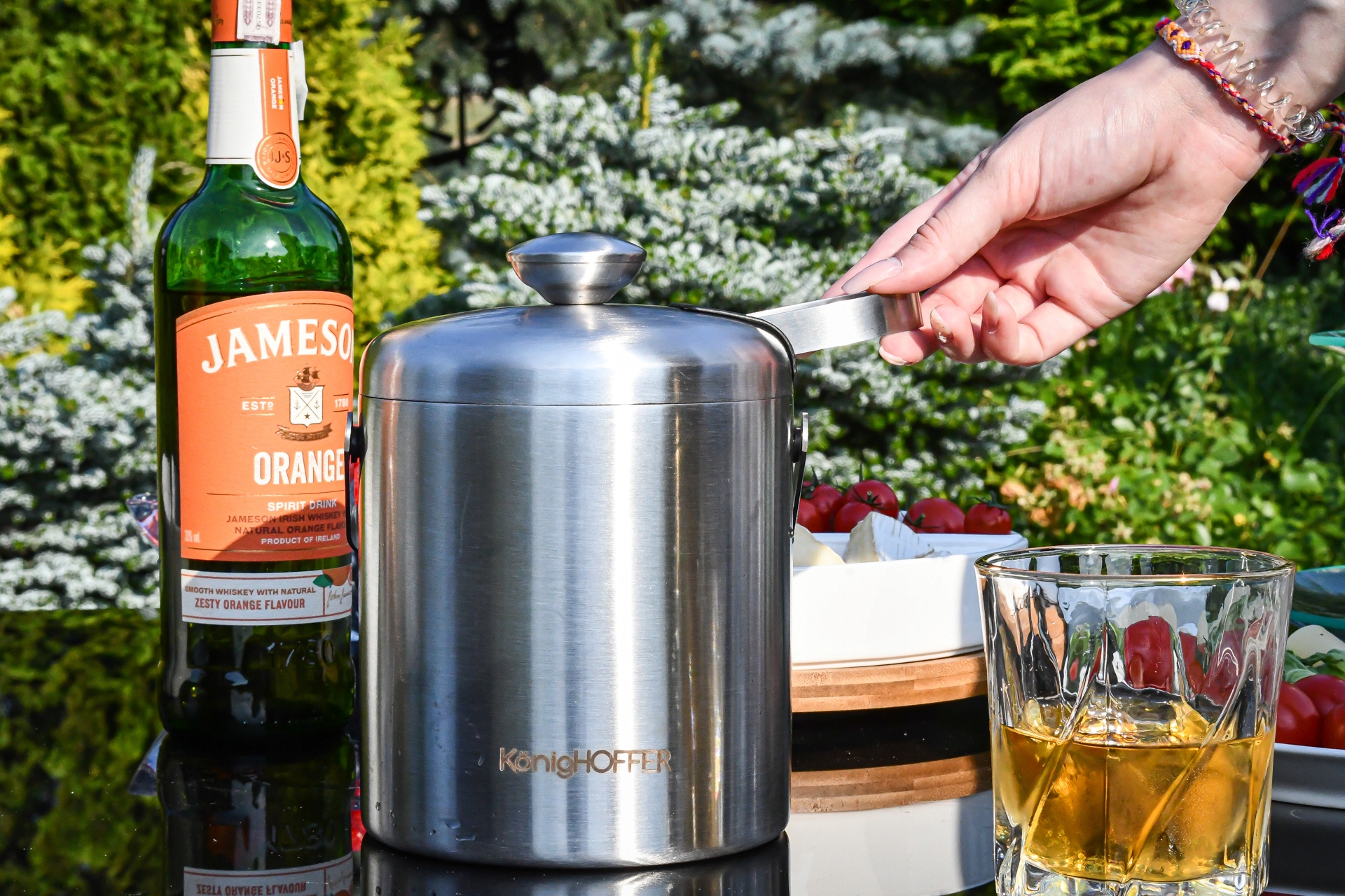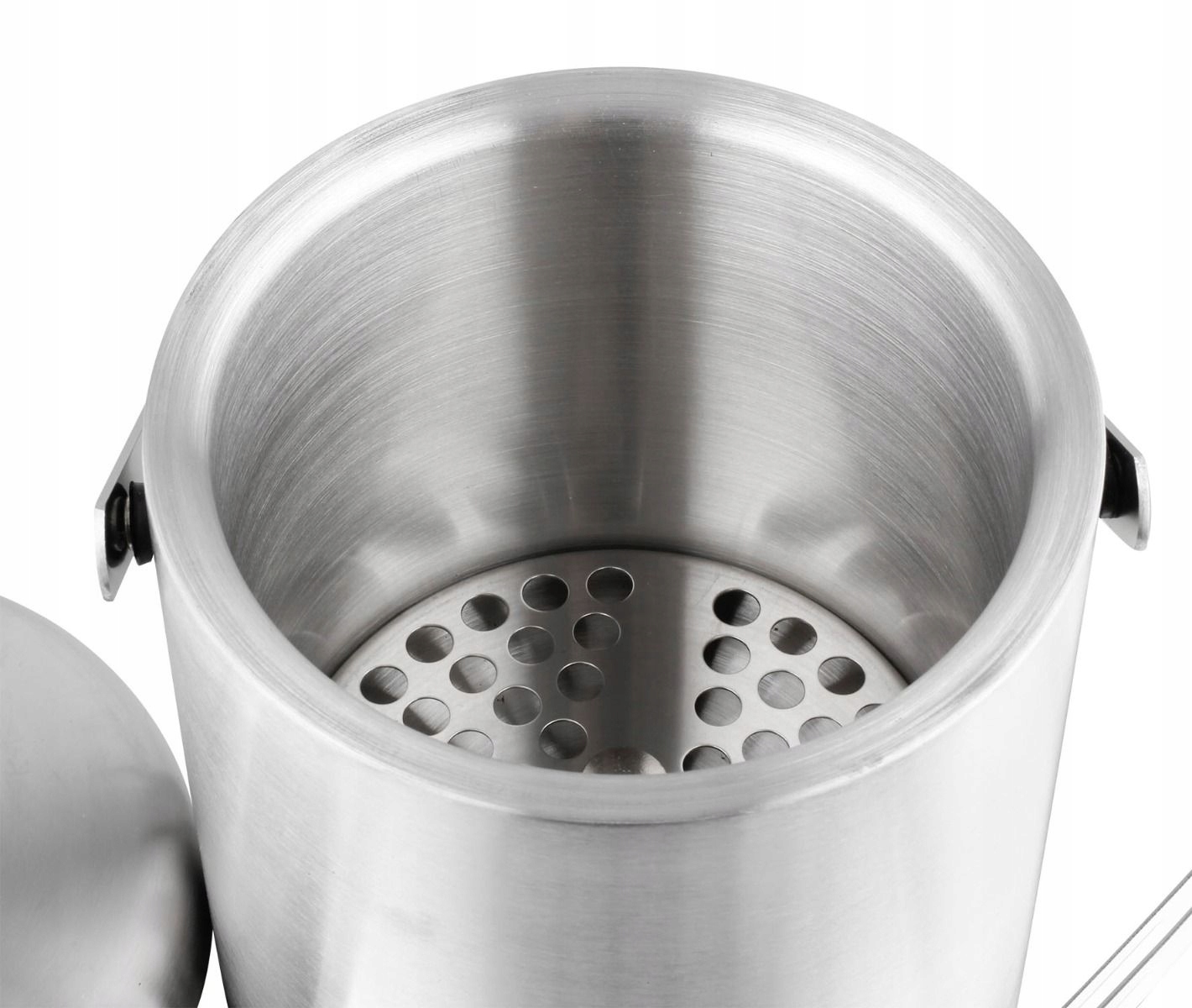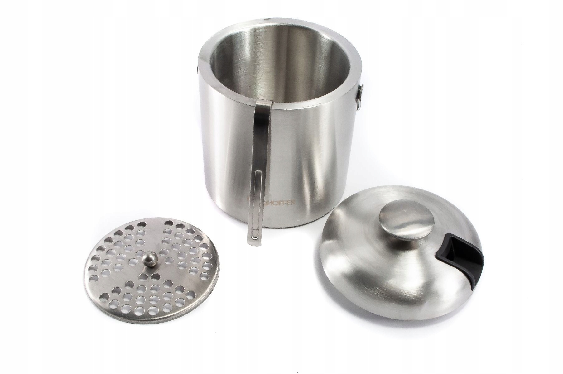 Ведро для льда изготовлено из высококачественной нержавеющей стали. Ведро оснащено щипцами для добавления кубиков льда. Крышка кастрюли позволяет спрятать щипцы. Крышка также оснащена удобной ручкой. Добавленный слив чрезвычайно удобен, удерживая лед над слоем воды, образовавшимся в результате его медленного таяния. Ведро теплоизолировано за счет использования двойных стенок, что позволяет хранить кубики льда и подавать их к напиткам в любое время.
