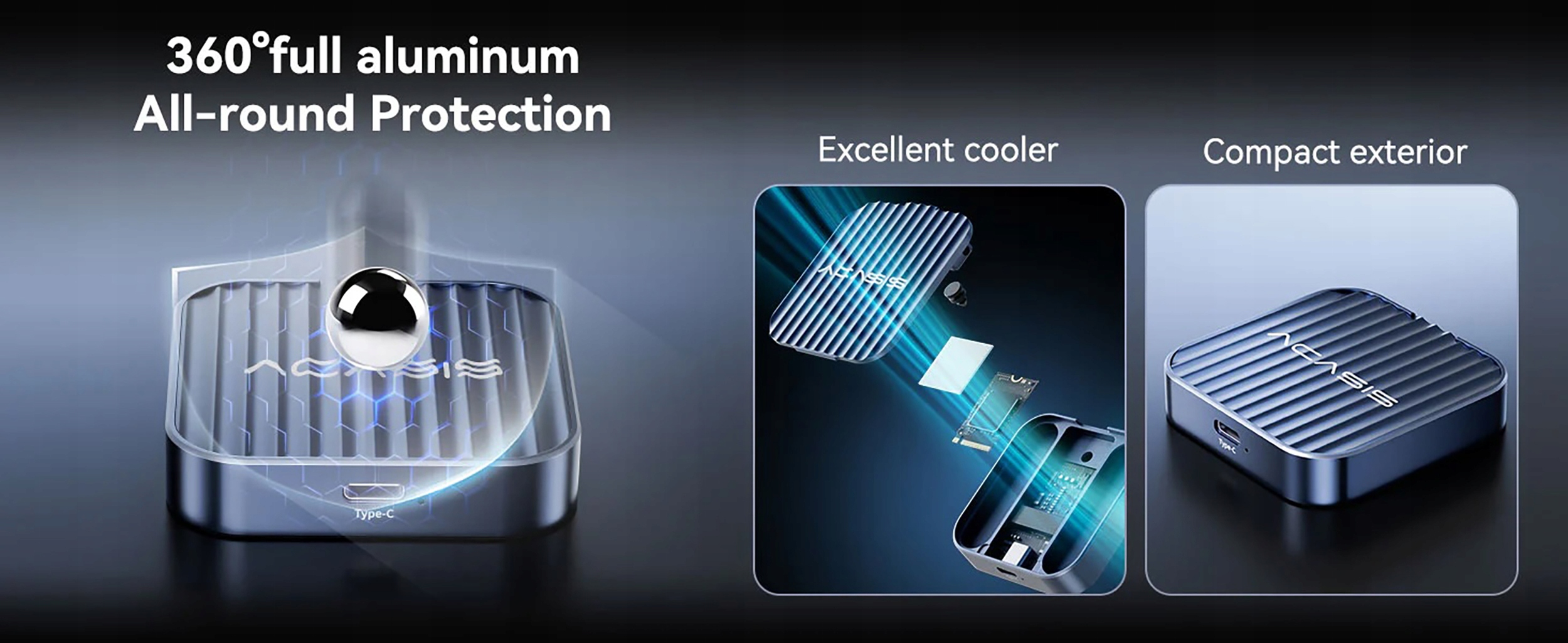 Оборудованный корпусом из алюминиевого сплава на 360°, двойным охлаждением и противоударной конструкцией, он обеспечивает надежную защиту данных, эффективно предотвращая потерю данных, вызванную столкновением и перегревом твердотельного накопителя.
