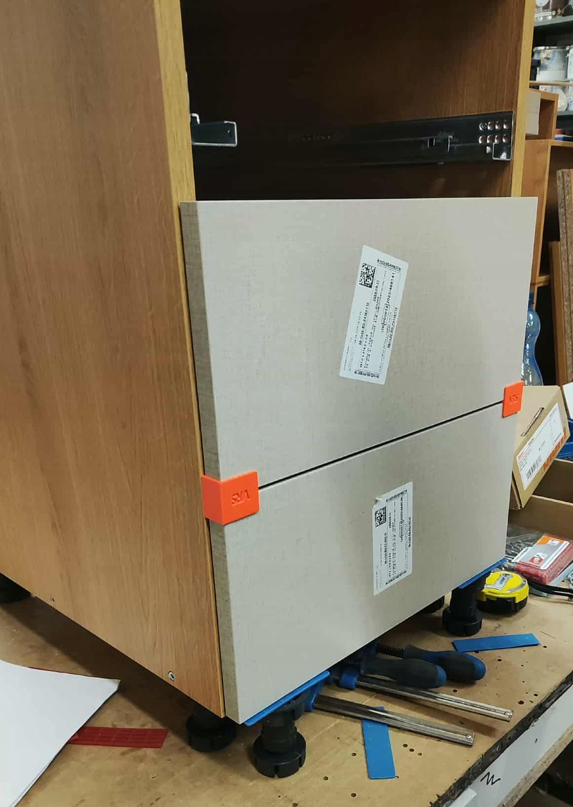 Проставка, изготовленная в технологии 3D-печати, предназначена для точной и повторяемой установки фасадов ящиков из плиты 18 мм.